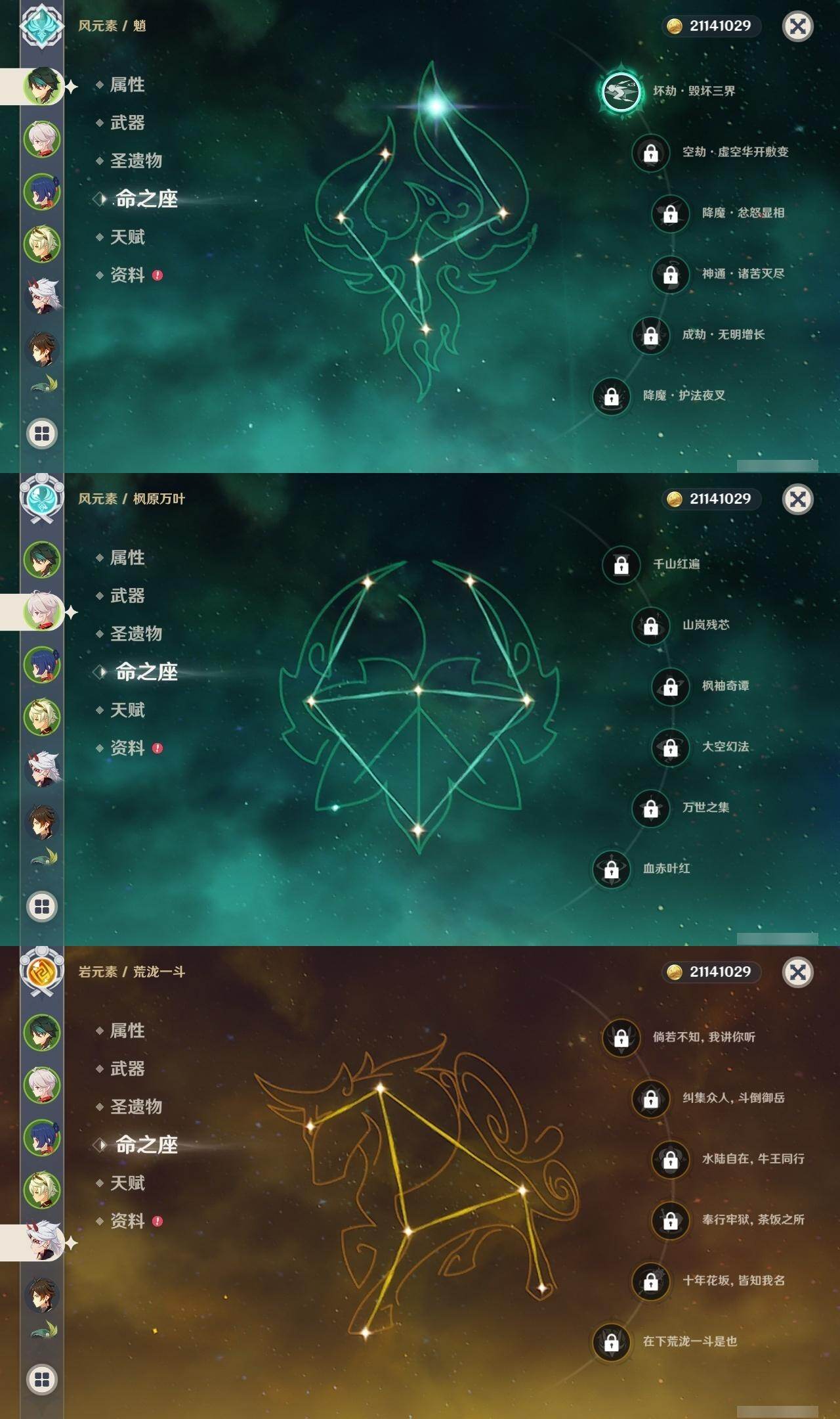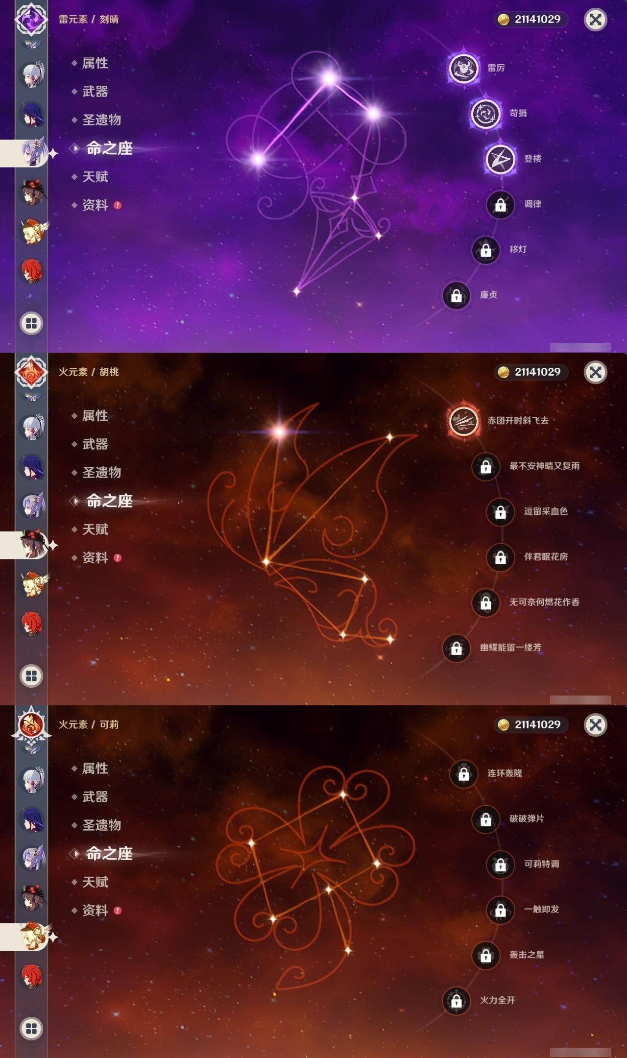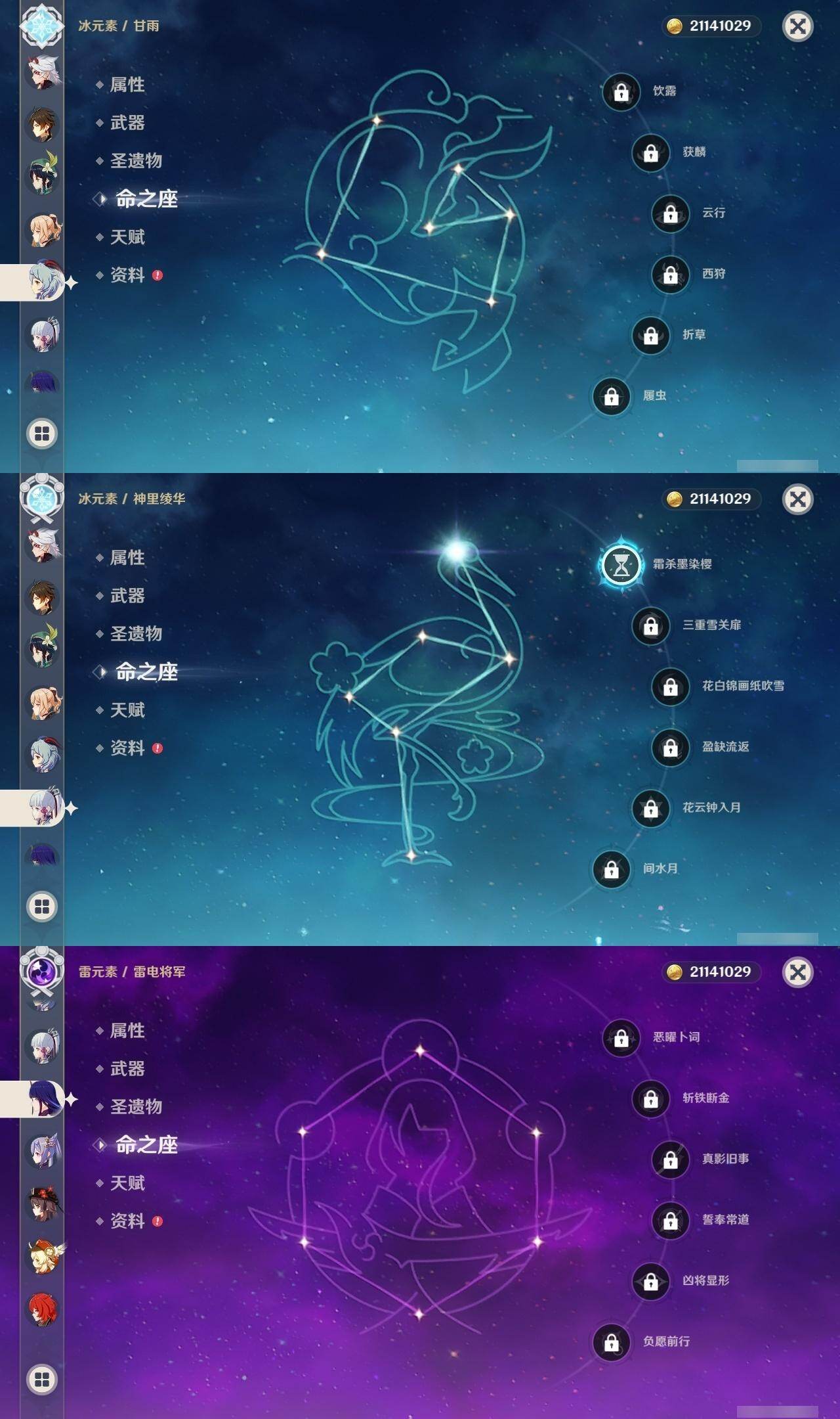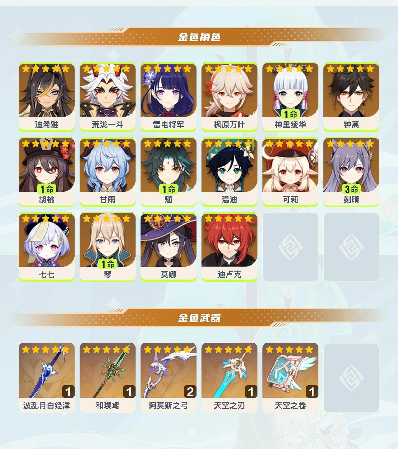 0命迪希雅,0命荒泷一斗,0命雷电将军,0命枫原万叶,1命神里绫华,0命钟离,1命胡桃,0命甘雨,1命魈,0命温迪,0命可莉,3命刻晴,0命七七,1命琴,0命莫娜,0命迪卢克,精1波乱月白经津,精1和璞鸢,精2阿莫斯之弓,精1天空之刃,精1天空之卷