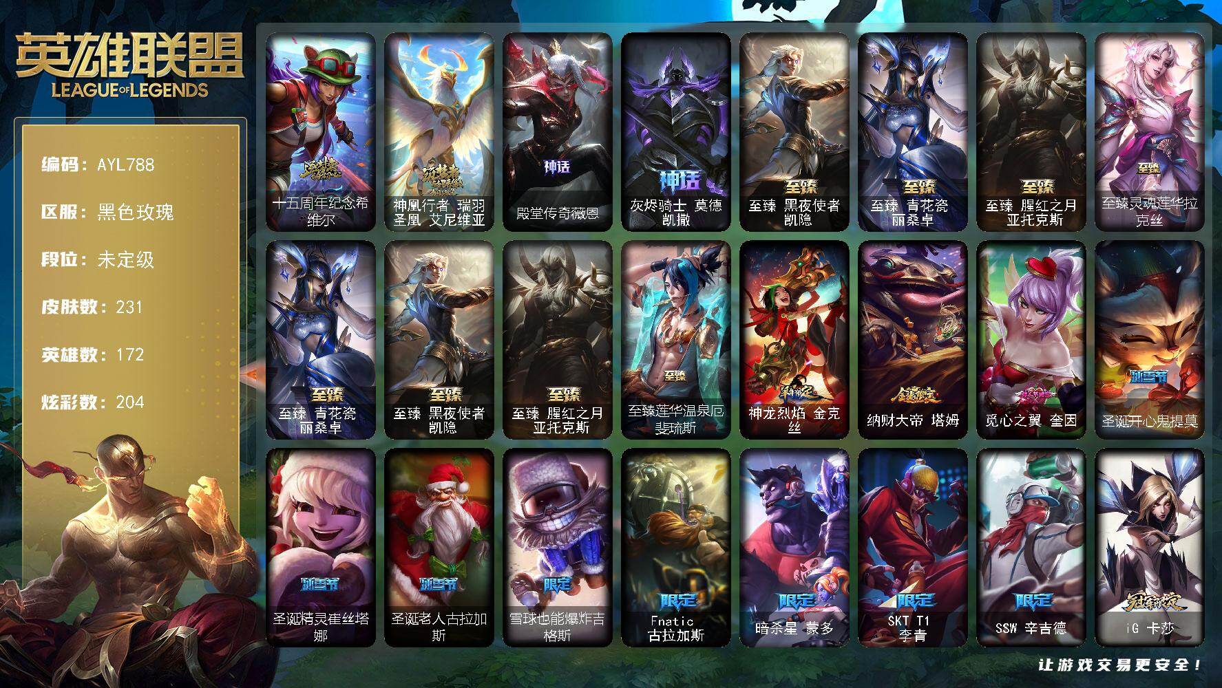 未定级段位-172英雄-231皮肤-204炫彩-0终极-9神话-25限定-20传说-36史诗