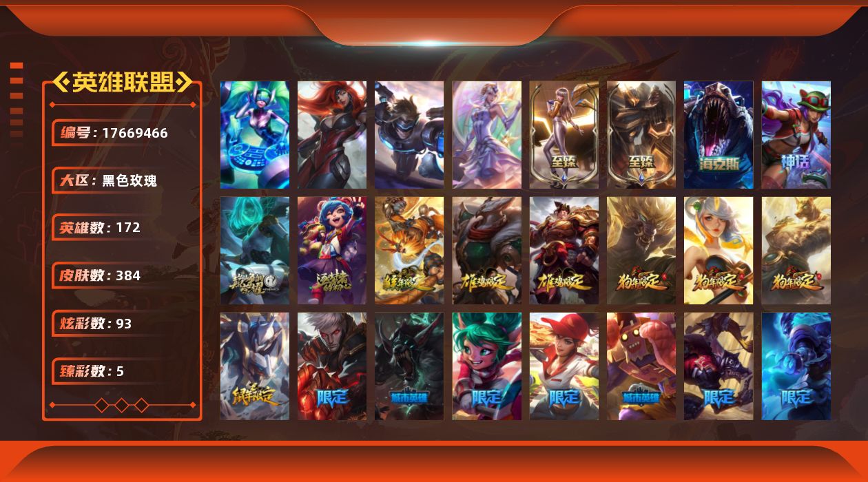 未定级段位-172英雄-384皮肤-93炫彩-4终极-6神话-54限定-52传说-96史诗
