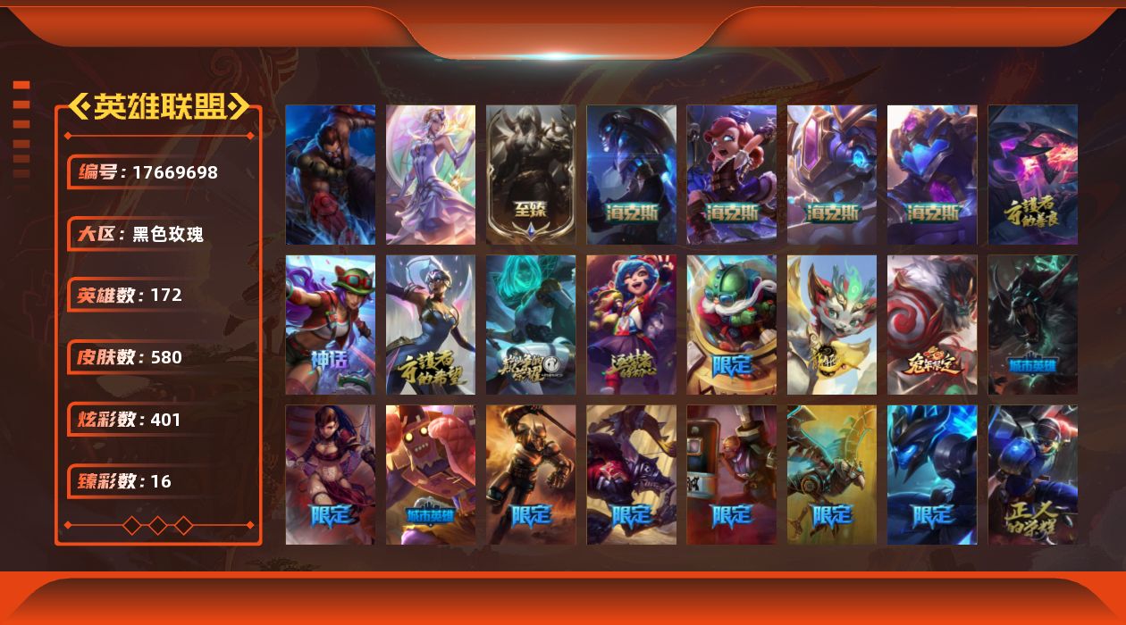 [17669698]未定级段位-172英雄-580皮肤-401炫彩-2终极-11神话-56限定-46传说-130史诗