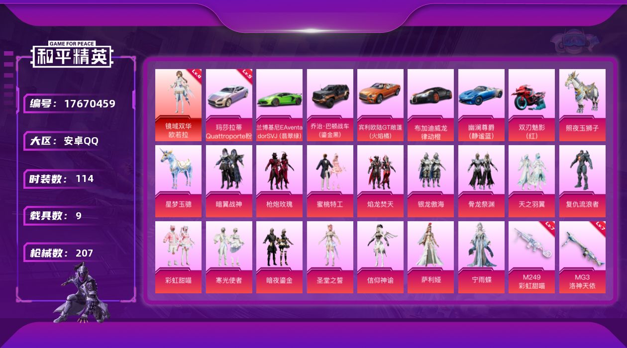 [17670459]安卓 手Q-1神装-15粉装-12特效枪-9载具-4粉色飞行器-78811热力值-9王牌印记-114套装-207枪皮