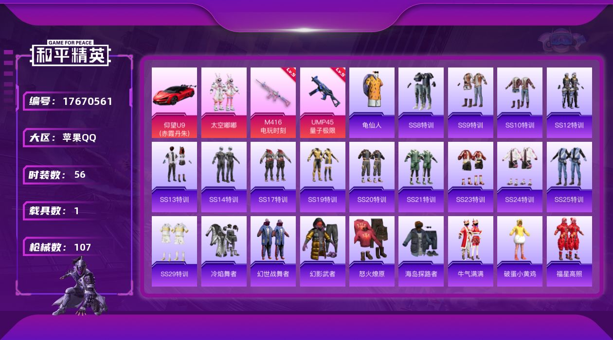 [17670561]苹果 手Q-1粉装-4特效枪-1载具-1粉色飞行器-31594热力值-5王牌印记-56套装-107枪皮