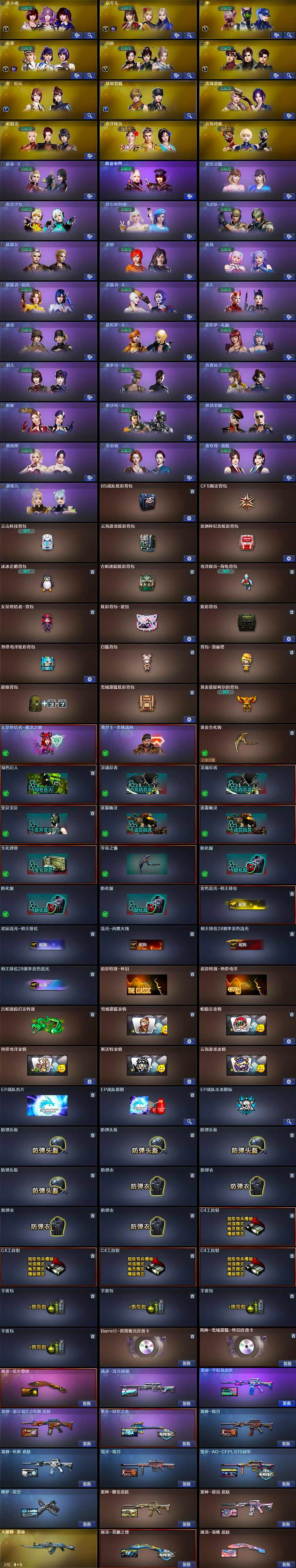【英雄级武器】:AK47-火麒麟*3,M4A1-雷神*2,M4A1-青龙,Scar Light-白虎,无影-神兵利器,QBZ03-云龙,黑武士-锦绣游龙,超新星-热带奇洋,金色蔷薇-古蛇迷踪,死神-雪域霜狐,王者之翼-觉醒版,黑骑士-海王,机械迷城-穹宇,Barrett-毁灭,AWM-裁决,王者凰鸣-觉醒版,沙鹰-修罗*4,沙鹰-天神*3,修罗-古蛇迷踪,屠龙*6,擎天,唐刀-神工天巧,龙啸-热带奇洋,斩神刀-雷暴,高爆手雷-雷暴,高爆手雷-幻灵,高爆手雷-神工天巧*2,高爆手雷-云龙*3,手雷-热带奇洋,高爆手雷-古蛇迷踪,闪光弹-雷暴,闪光弹-幻灵,闪光弹-神工天巧*2,闪光弹-云龙*3,烟雾弹-雷暴,烟雾弹-幻灵,烟雾弹-神工天巧*2,烟雾弹-云龙*3,烟雾弹-古蛇迷踪,M4A1-赤狱骑士,AWM-昌龙,Barrett-碧霄极光