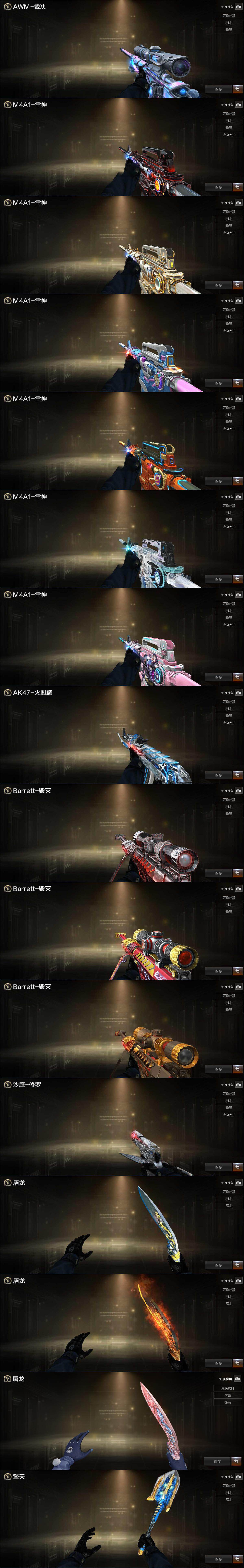 【皮肤】:裁决-流光秘银,雷神-暗月,雷神-耀金皮肤,雷神-宇航兔皮肤,雷神-源计划2.0专属 皮肤,雷神-化蛇 皮肤,雷神-诺拉 皮肤,火麒麟-雷神,毁灭-暗月,毁灭-AG-CFPLS15冠军,毁灭-英雄计划 皮肤,修罗-星空,屠龙-荣耀之锋,屠龙-星火燎原,屠龙-春桃 皮肤,擎天-冠军之击