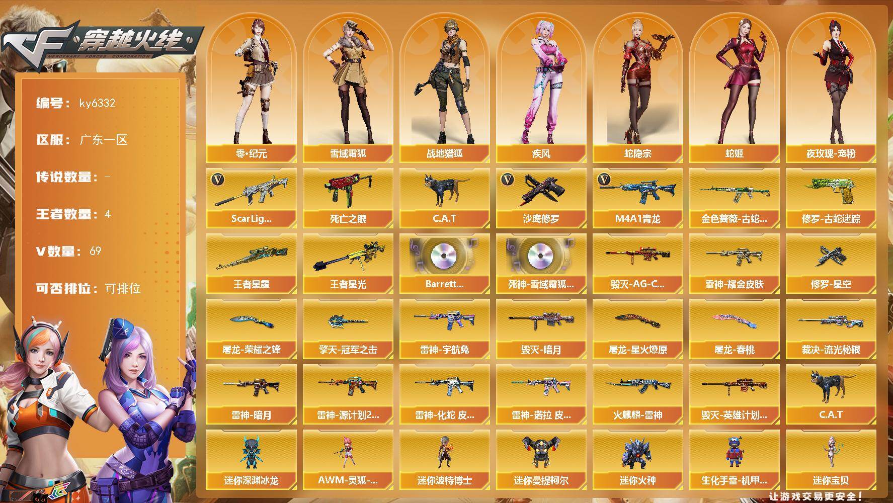 [17670727]【ky6332】广东一区-67V-4王者武器数-0炫金武器数 【热门武器】:Scar Light-白虎,M4A1-青龙,金色蔷薇-古蛇迷踪,修罗-古蛇迷踪,死亡之眼,C.A.T,沙鹰-修罗*4 【王者炫金武器】:王者星霆,王者星光 【音效卡】:Barrett-碧霄极光音效卡,死神-雪域霜狐-怀旧音效卡 【皮肤】:裁决-流光秘银,雷神-暗月,雷神-耀金皮肤,雷神-宇航兔皮肤,雷神-源计划2.0专属 皮肤,雷神-化蛇 皮肤,雷神-诺拉 皮肤,火麒麟-雷神,毁灭-暗月,毁灭-AG-CFPLS15冠军,毁灭-英雄计划 皮肤,修罗-星空,屠龙-荣耀之锋,屠龙-星火燎原,屠龙-春桃 皮肤,擎天-冠军之击 【角色】:关小雨,岚兮儿,隼,雨墨,司雨,华,零·纪元,战地猎狐,雪域霜狐,蛇隐宗,奇洋探员,云海玲珑,暗夜-X,暗夜审判,初恋灵狐,电竞少女,芳心审判者,飞虎队-X,风暴女,虎妞,疾风,猎狐者-追月,灵狐者-X,龙儿,麻雀,曼陀罗-X,曼陀罗-礼服,萌儿,潘多拉-X,青霞仙子,蛇姬,斯沃特-X,铁骑荣耀,兔囡囡,维纳斯,雪莉杨,夜玫瑰-宠粉,游珑儿 【人偶武器】:迷你宝贝,AWM-灵狐-15周年嘉年华,C.A.T,迷你深渊冰龙,迷你波特博士,迷你曼提柯尔,迷你火种,生化手雷-机甲核心*3 【暴走生化】:死亡之眼 【挑战大师】:冰龙粉碎者-白马银枪,激光毁灭者III-白马银枪,试炼破坏者III 【英雄级武器】:AK47-火麒麟*3,M4A1-雷神*2,M4A1-青龙,Scar Light-白虎,无影-神兵利器,QBZ03-云龙,黑武士-锦绣游龙,超新星-热带奇洋,金色蔷薇-古蛇迷踪,死神-雪域霜狐,王者之翼-觉醒版,黑骑士-海王,机械迷城-穹宇,Barrett-毁灭,AWM-裁决,王者凰鸣-觉醒版,沙鹰-修罗*4,沙鹰-天神*3,修罗-古蛇迷踪,屠龙*6,擎天,唐刀-神工天巧,龙啸-热带奇洋,斩神刀-雷暴,高爆手雷-雷暴,高爆手雷-幻灵,高爆手雷-神工天巧*2,高爆手雷-云龙*3,手雷-热带奇洋,高爆手雷-古蛇迷踪,闪光弹-雷暴,闪光弹-幻灵,闪光弹-神工天巧*2,闪光弹-云龙*3,烟雾弹-雷暴,烟雾弹-幻灵,烟雾弹-神工天巧*2,烟雾弹-云龙*3,烟雾弹-古蛇迷踪,M4A1-赤狱骑士,AWM-昌龙,Barrett-碧霄极光 【源级武器】:火麒麟-雷神,源-黑龙,御·黑龙-龙