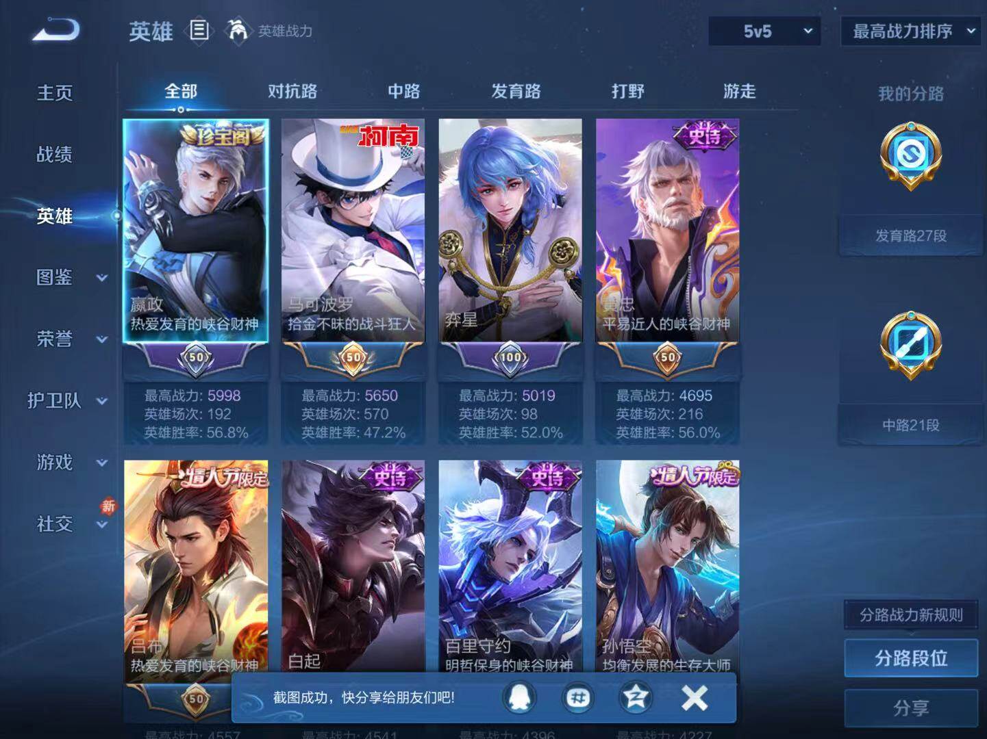 - [11938015]V3 1传说 104英雄 86皮肤 可修改实名 安全保护中 杨戬小国标 限定皮:鸣野蒿 史诗皮:鸭鸭历险记-刘禅,星界战将,石田雨龙,百相守梦-黄忠,千年之狐,水果甜心,德古拉伯爵,鬼剑武藏,乐园奇幻夜,缤纷独角兽,乘风破浪,水晶猎龙者,原初追逐者,鹰眼统帅,未来纪元-赵云