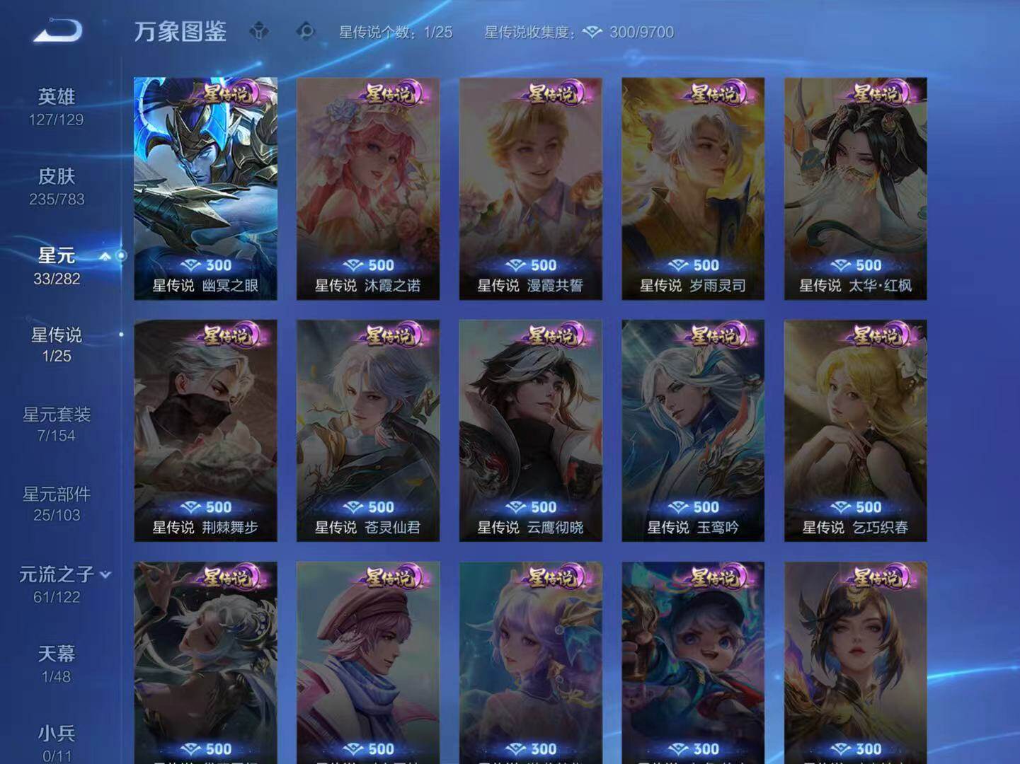 【限定皮肤】:蒙犽顽岩魄,姜子牙天穹之誓,杨戬破阵退雄兵,李白谪仙醉月,狄仁杰阴阳师,赵云皇家上将,嬴政优雅恋人,孙尚香蔷薇恋人,元歌无心,夏侯惇朔风刀,甄姬游园惊梦,狄仁杰魔术师,狄仁杰万华元夜,达摩星际陆战队,达摩沙漠行僧,项羽海滩派对,老夫子醍醐杖,程咬金演武夺筹,韩信飞衡,兰陵王金庭之子,孙悟空至尊宝,李元芳银河之约,李元芳云中旅人,钟馗驱傩正仪,雅典娜黎明之约,鬼谷子原初探秘者,鬼谷子五谷丰年,苏烈千军破阵,百里玄策原初追逐者,弈星混沌棋,梦奇顽趣,沈梦溪大漠名商,明世隐疑决卦,裴擒虎李小龙,米莱狄胡桃异想国,云中君纤云弄巧,盾山御銮,猪八戒猪悟能,上官婉儿梁祝,鲁班大师探海日志,桑启海盐诗旅,艾琳流音漫舞,阿古朵江河有灵,张良古海寻踪,蒙犽百解令,蒙恬荣光圣徽,鬼谷子天穹祈灯,伽罗琥珀纪元,姬小满妄想食味,吕布曦玄引,沈梦溪龙舞盛年,刘邦剑破天穹,芈月浮光幕影,周瑜熔金海岸