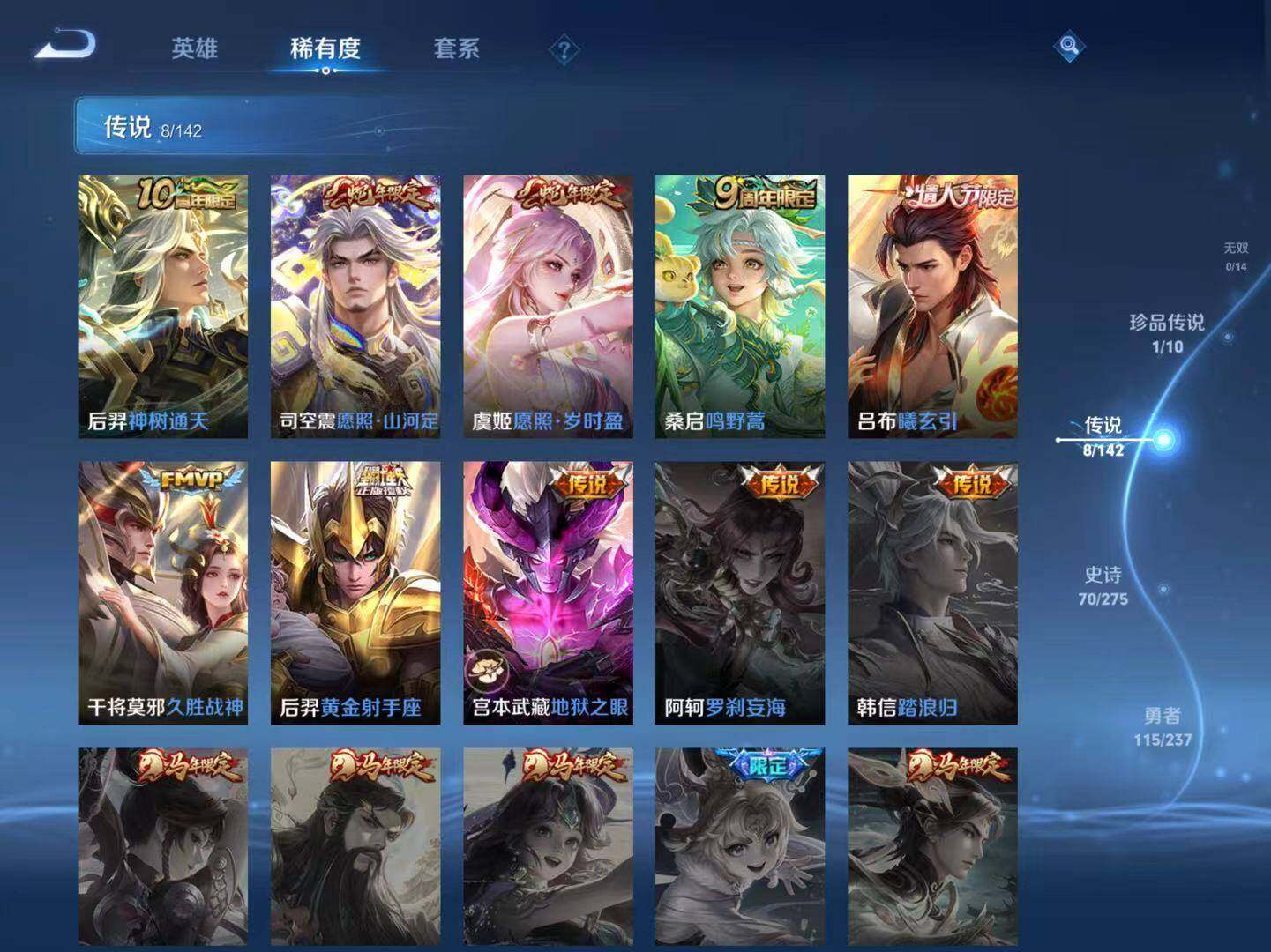 【传说皮肤】:后羿神树通天,司空震愿照山河定,虞姬愿照岁时盈,桑启鸣野蒿,吕布曦玄引,干将莫邪久胜战神,后羿黄金射手座,宫本武藏地狱之眼