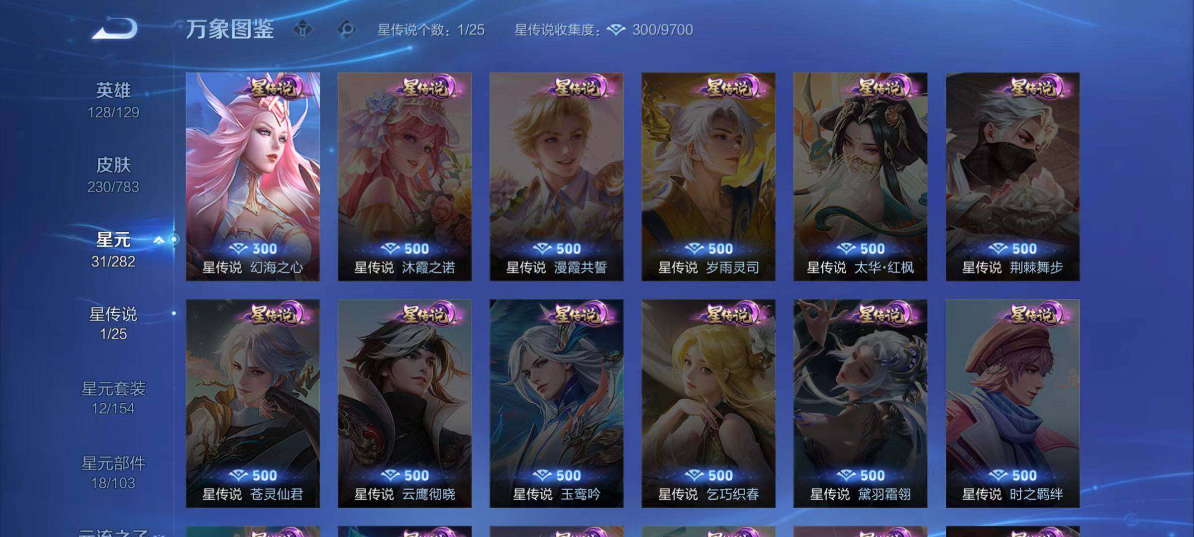 亚瑟狮心王,庄周蜃楼王,孙膑妖精王,扁鹊炼金王,虞姬凯尔特女王,白起狰,太乙真人饕餮,曹操烛龙,芈月重明,典韦穷奇,狂铁御狮,米莱狄御霄,夏侯惇朔风刀,明世隐疑决卦,老夫子醍醐杖,鬼谷子原初探秘者,狄仁杰万华元夜,程咬金演武夺筹,钟馗驱傩正仪,苏烈千军破阵,沈梦溪星空之诺,李元芳银河之约,马可波罗暗影游猎,弈星混沌棋,达摩沙漠行僧,兰陵王金庭之子,沈梦溪大漠名商,李元芳云中旅人,桑启海盐诗旅,裴擒虎擒涛扼浪,鲁班大师探海日志,张良古海寻踪