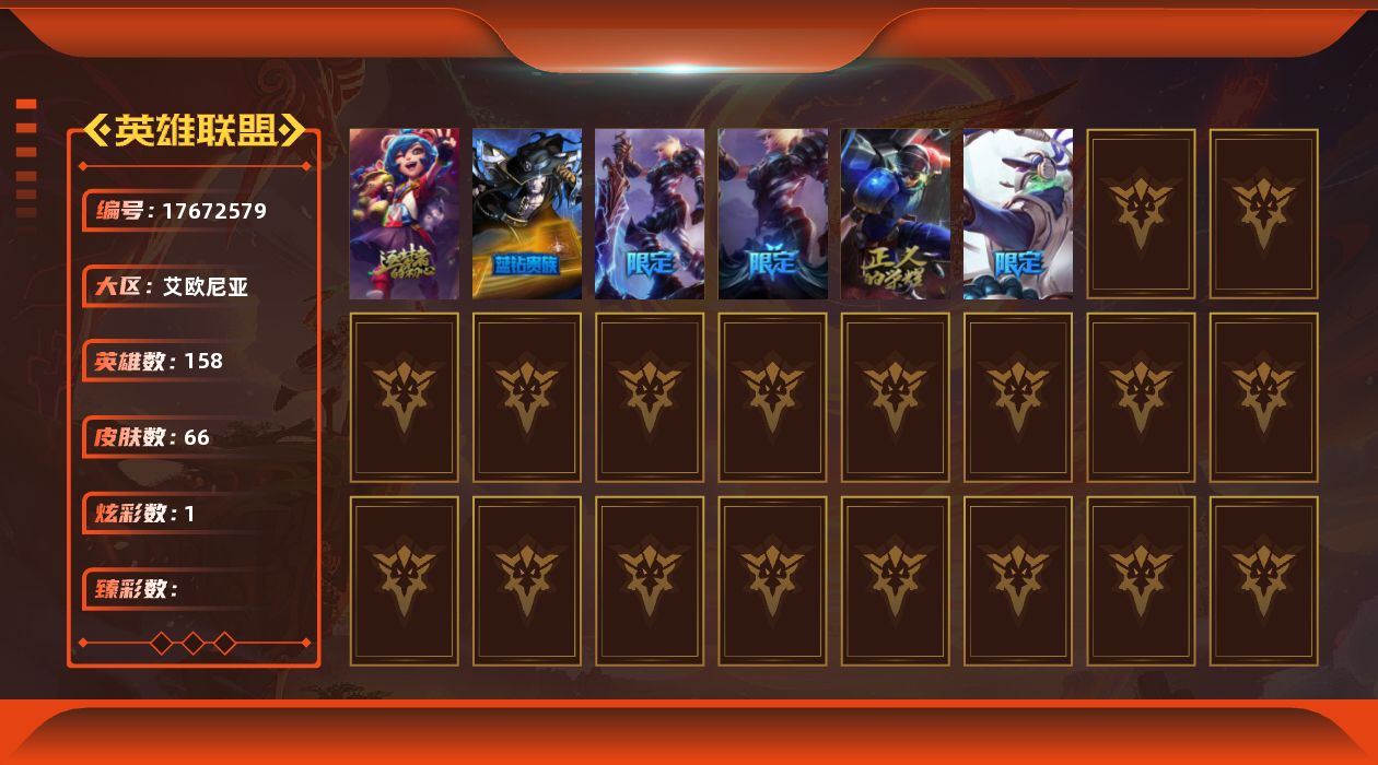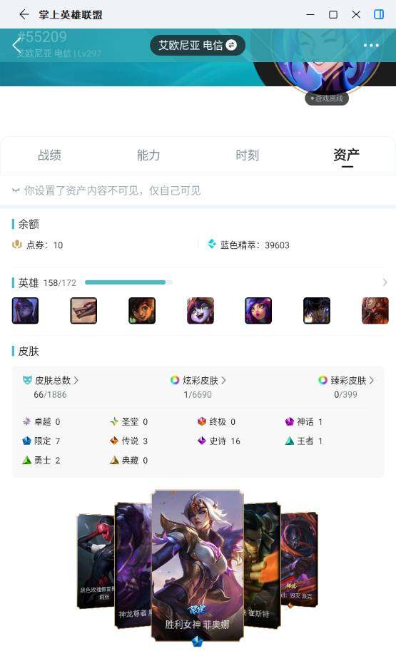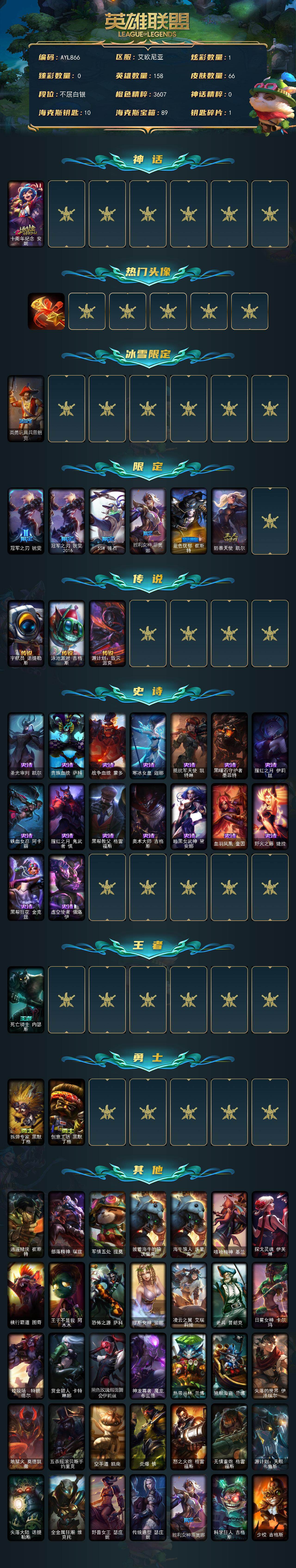 [17672579]白银段位-158英雄-66皮肤-1炫彩-0终极-1神话-7限定-3传说-16史诗