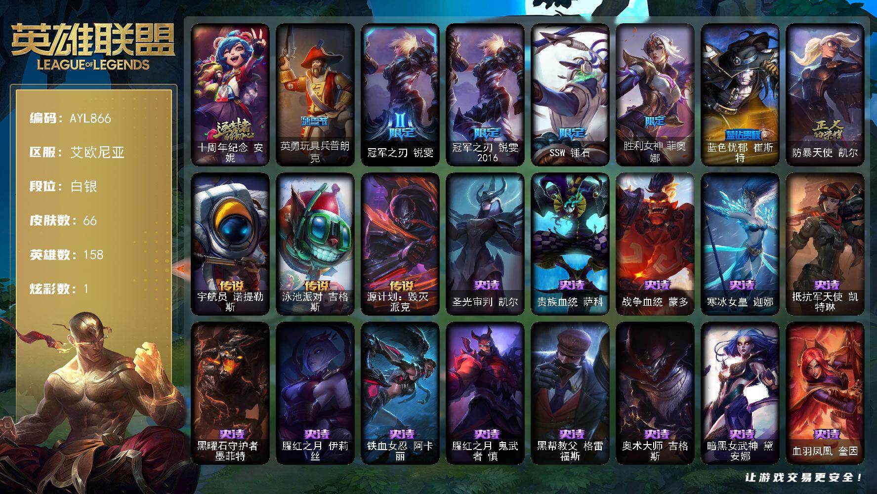[17672579]白银段位-158英雄-66皮肤-1炫彩-0终极-1神话-7限定-3传说-16史诗 【神话皮肤】:十周年纪念安妮 【热门头像】:卡特琳娜的匕首头像 【冰雪限定】:英勇玩具兵普朗克 【限定皮肤】:冠军之刃锐雯,冠军之刃锐雯2016,SSW锤石,胜利女神菲奥娜,蓝色忧郁崔斯特,防暴天使凯尔 【传说皮肤】:宇航员诺提勒斯,泳池派对吉格斯,源计划毁灭派克 【史诗皮肤】:圣光审判凯尔,贵族血统萨科,战争血统蒙多,寒冰女皇迦娜,抵抗军天使凯特琳,黑曜石守护者墨菲特,腥红之月伊莉丝,铁血女忍阿卡丽,腥红之月鬼武者慎,黑帮教父格雷福斯,奥术大师吉格斯,暗黑女武神黛安娜,血羽凤凰奎因,野火之藤婕拉,黑帮狂花金克丝,虚空使者俄洛伊 【王者皮肤】:死亡骑士内瑟斯 【勇士皮肤】:拆弹专家黑默丁格,创意工坊黑默丁格 【其他皮肤1】:逍遥赌侠崔斯特,部落精神瑞兹,军情五处提莫,披着海牛的狼沃里克,海牛狼人沃里克,嘻哈精神基兰,探戈灵魂伊芙琳,横行霸道图奇,王子不是我阿木木,恐怖之源萨科,缪斯女神娑娜,凌云之翼艾瑞莉娅,老兵普朗克,日冕女神卡尔玛,垃圾场特朗德尔,赏金猎人卡特琳娜,黑色玫瑰假面舞会伊莉丝,神龙尊者魔龙布兰德,热带丛林兰博,独眼海盗兰博,失落的世界伊泽瑞尔,地狱火莫德凯撒,五杀摇滚贝斯手约里克,空手道凯南,炎爆慎,怒之火炮格雷福斯,无情重炮格雷福斯,源计划天眼韦鲁斯,失落大陆诺提勒斯,全金属狂潮维克托,野兽女王瑟庄妮,传统造型瑟庄妮,胜利女神菲奥娜,科学狂人吉格斯,少校吉格斯,破败军团德莱文,血石骑士赫卡里姆