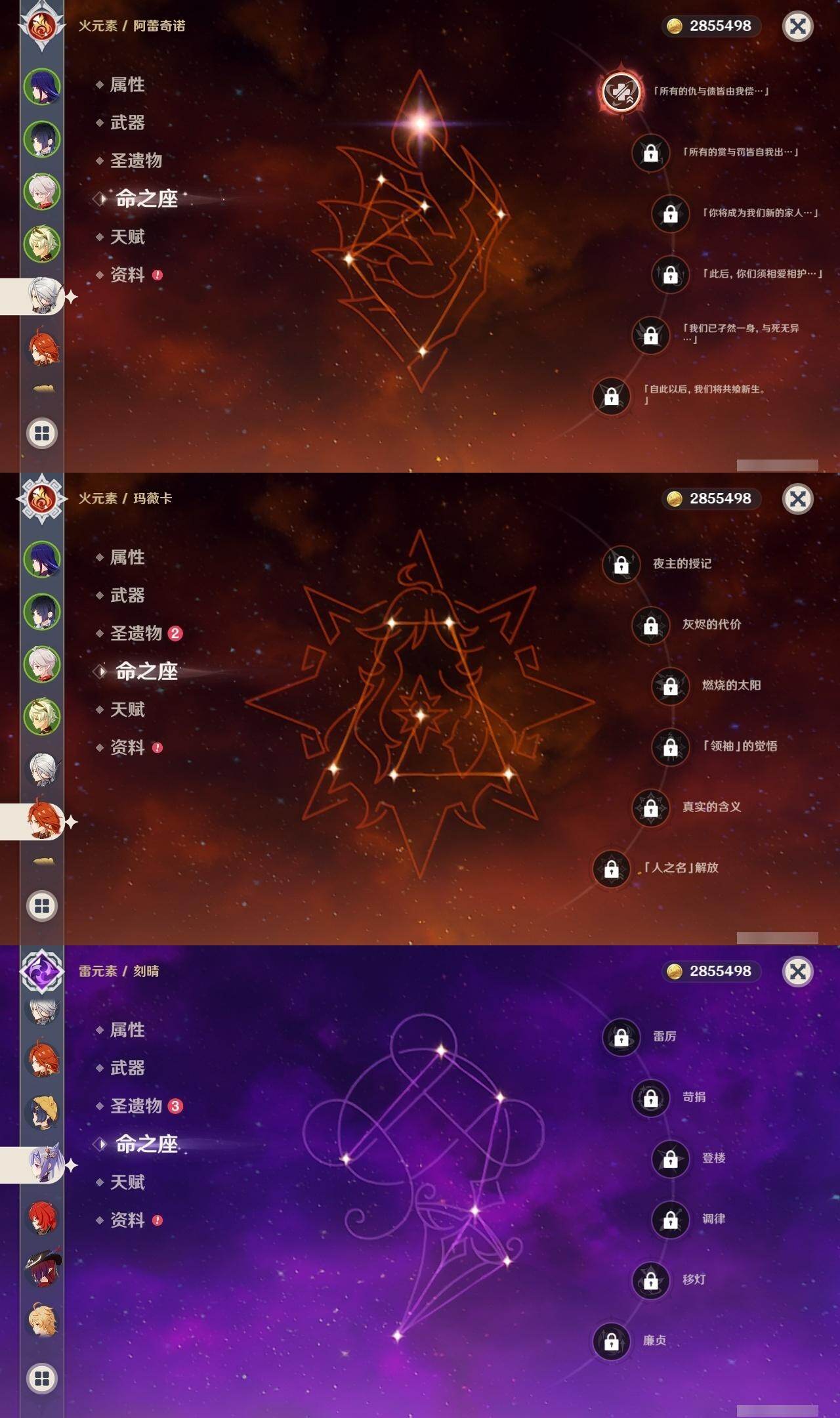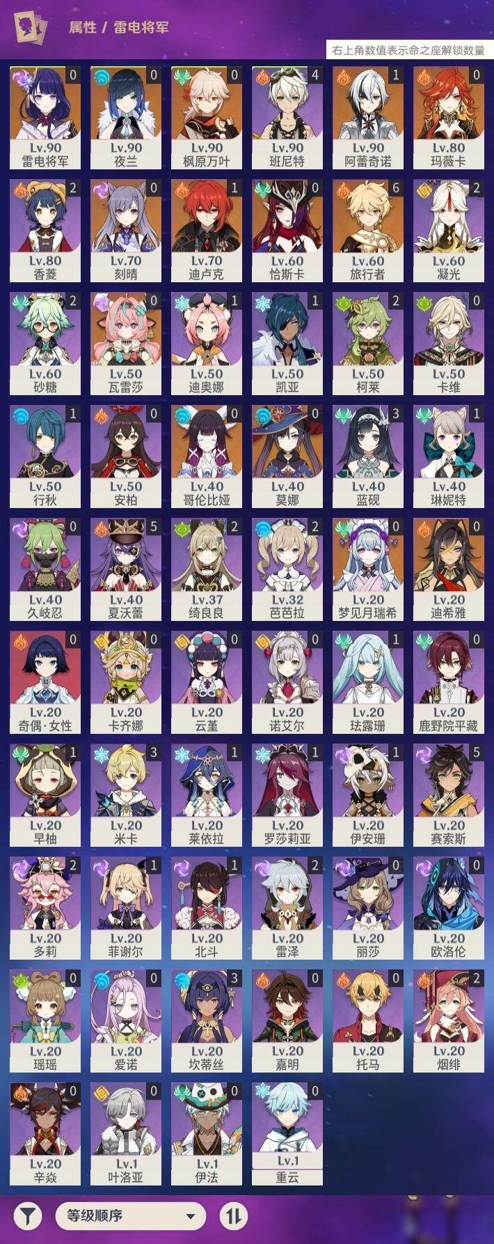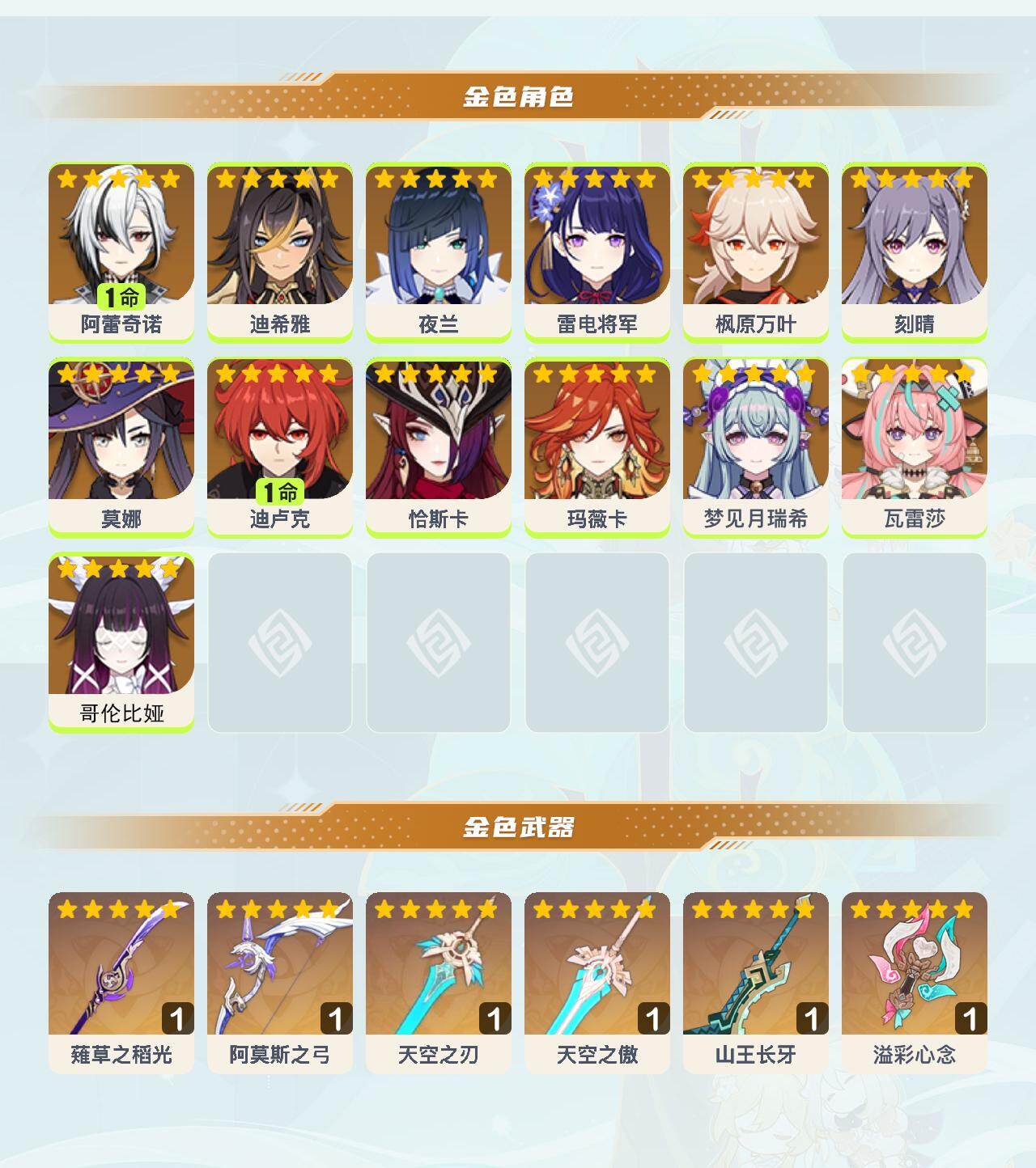 1命阿蕾奇诺,0命迪希雅,0命夜兰,0命雷电将军,0命枫原万叶,0命刻晴,0命莫娜,1命迪卢克,0命恰斯卡,0命玛薇卡,0命梦见月瑞希,0命瓦雷莎,0命哥伦比娅,精1薙草之稻光,精1阿莫斯之弓,精1天空之刃,精1天空之傲,精1山王长牙,精1溢彩心念