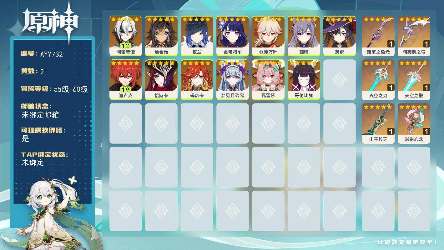 [17672752]56级/21黄/男主/13个五星角色/6个五星武器 1命阿蕾奇诺,0命迪希雅,0命夜兰,0命雷电将军,0命枫原万叶,0命刻晴,0命莫娜,1命迪卢克,0命恰斯卡,0命玛薇卡,0命梦见月瑞希,0命瓦雷莎,0命哥伦比娅,精1薙草之稻光,精1阿莫斯之弓,精1天空之刃,精1天空之傲,精1山王长牙,精1溢彩心念