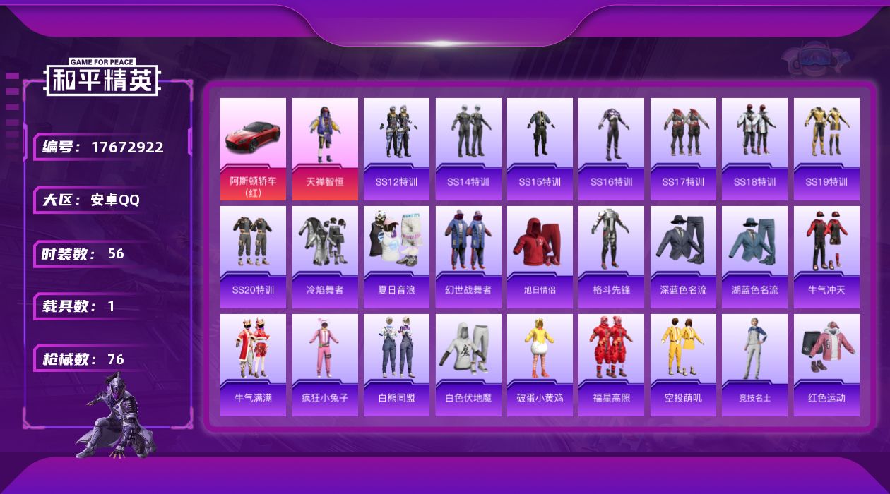 [17672922]安卓 手Q-1粉装-2特效枪-1载具-1粉色飞行器-20897热力值-1王牌印记-56套装-76枪皮