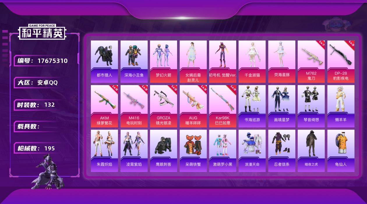 [17675310]安卓 手Q-5粉装-8特效枪-0载具-2粉色飞行器-55816热力值-12王牌印记-132套装-195枪皮