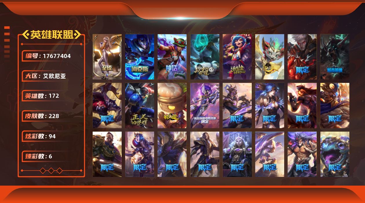 [17677404]未定级段位-172英雄-228皮肤-94炫彩-0终极-5神话-32限定-19传说-49史诗