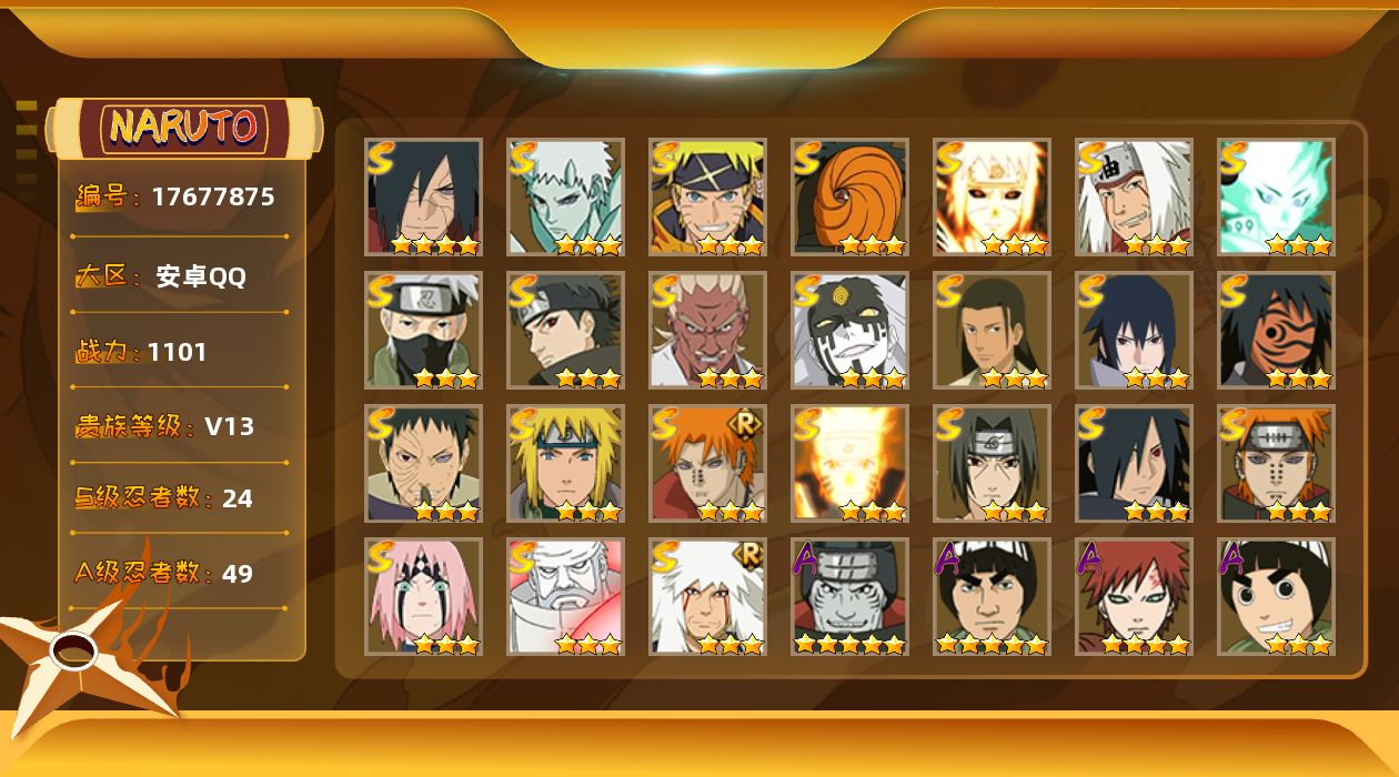 【S级忍者】:宇智波斑「秽土转生·解」(4星),春野樱「忍界大战」(3星),宇智波带土「忍界大战」(3星),艾「忍界大战」(3星),宇智波鼬「须佐能乎」(3星),宇智波止水「须佐能乎」(3星),旗木卡卡西「须佐能乎」(3星),宇智波斑「木叶创立」(3星),千手柱间「木叶创立」(3星),自来也「舞之豪杰」(3星),自来也「传说中的三忍」(3星),波风水门(3星),神秘面具男「红夜之刃」(3星),漩涡鸣人「九喇嘛连结」(3星),佩恩「天道」(3星),佩恩·天道「超」(3星),宇智波佐助「永恒万花筒」(3星),大筒木金式(3星),大筒木桃式(3星),大筒木舍人「最终章」(3星),波风水门「九喇嘛连结」(3星),宇智波斑「五影会谈」(3星),漩涡鸣人·宇智波佐助(3星),宇智波带土「十尾人柱力」(3星)