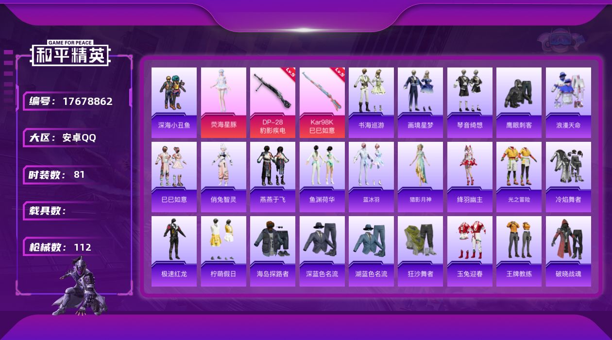 [17678862]安卓 手Q-1粉装-4特效枪-0载具-0粉色飞行器-27708热力值-1王牌印记-81套装-112枪皮 【热门品类】:套装-浪漫天命,套装-深海小丑鱼 【粉色套装】:角色-荧海星豚 【粉色枪皮等级】:ACE32-萌骑漫游(三级),Kar98K-巳巳如意(五级),Mk14-福马献瑞(五级),DP-28-豹影疾电(五级) 【粉色枪皮】:ACE32-萌骑漫游,Kar98K-巳巳如意,Mk14-福马献瑞,DP-28-豹影疾电 【粉色降落伞】:创世·救赎降落伞,智耀战神降落伞,喜羊羊与灰太狼降落伞,异瞳寒姬降落伞,炫彩糖果降落伞 【稀有套装】:套装-巳巳如意,套装-雪国风尚,套装-马上来财,角色-俏兔智灵,套装-燕燕于飞,套装-鱼渊荷华,套装-蓝冰羽,角色-猎影月神,角色-绛羽幽主,套装-书海巡游,套装-画境星梦,套装-琴音绮想,套装-雨过天青,套装-红釉青花 【稀有枪皮】:AKM-影袭,AKM-破晓战魂,M16A4-千金淑猫,SCAR-L-夜灯,M416-蓝色火焰,GROZA-影袭,AUG-耀粉歌者,M762-天降萌叽,M762-彩虹符号,G36C-桃粉嫣然,AC-VAL-天降萌叽,ACE32-画境星梦,UZI-影袭,UZI-月影灵韵,UMP45-夜灯,UMP45-蓝色火焰,UMP45-极意拳锋,汤姆逊-炫彩节奏,汤姆逊-像素花束,MP5K-画境星梦,AKS-74U-鬼刀,P90-巳巳如意,Kar98K-影袭,M24-影袭,Mini14-耀粉歌者,Mk14-治愈之星,M1加兰德-画境星梦,S686-彩虹符号,S686-巳巳如意,S12K-夜灯,S12K-智耀战神,DBS-彩虹符号,DBS-创世·救赎,AA12-G-画境星梦,M249-破晓战魂,DP-28-彩虹符号,MG3-幻世战舞者,平底锅-画境星梦,破片手榴弹-巳巳如意 【其他套装】:套装-光之冒险,套装-冷焰舞者,套装-极速红龙,套装-柠萌假日,套装-浪漫天命,套装-海岛探路者,套装-深蓝色名流,套装-湖蓝色名流,套装-狂沙舞者,套装-玉兔迎春,套装-王牌教练,套装-破晓战魂,套装-破蛋小黄鸡,套装-竞技名士,套装-红潮炫舞,套装-绮丽涂鸦,套装-绯格组合,套装-缤纷果语,套装-耀粉歌者,套装-街头潮人,套装-都市魅力,套装-长空猛禽,套装-阳光火鸡,套装-青涩时光,套装-顽皮玉兔,套装-魅力单车,套装-鹤鸣,套装-