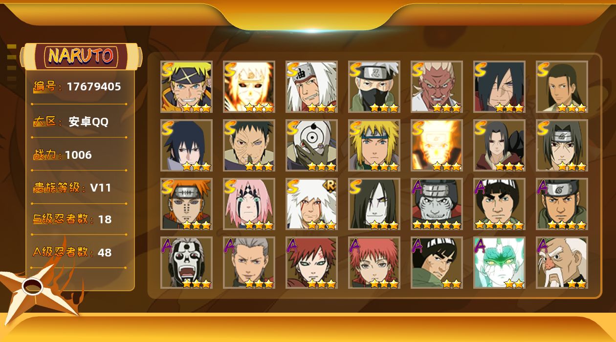 【S级忍者】:宇智波鼬「秽土转生」(3星),宇智波斑「秽土转生·解」(3星),春野樱「忍界大战」(3星),宇智波带土「忍界大战」(3星),艾「忍界大战」(3星),宇智波鼬「须佐能乎」(3星),旗木卡卡西「须佐能乎」(3星),千手柱间「木叶创立」(3星),自来也「舞之豪杰」(3星),大蛇丸(3星),自来也「传说中的三忍」(3星),波风水门(3星),漩涡鸣人「九喇嘛连结」(3星),佩恩「天道」(3星),宇智波佐助「永恒万花筒」(3星),宇智波斑 「白面具」(3星宇智波斑「白面具」),波风水门「九喇嘛连结」(3星),漩涡鸣人·宇智波佐助(3星)