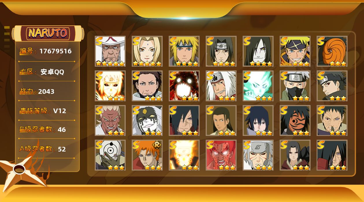 【S级忍者】:长门「秽土转生」(3星),猿飞日斩「秽土转生」(3星),波风水门「秽土转生」(3星),千手扉间「秽土转生」(3星),千手柱间「秽土转生」(3星),宇智波鼬「秽土转生」(3星),宇智波斑「秽土转生」(3星),宇智波斑「秽土转生·解」(3星),大野木「忍界大战」(3星),春野樱「忍界大战」(3星),宇智波带土「忍界大战」(3星),艾「忍界大战」(3星),宇智波鼬「须佐能乎」(4星),宇智波止水「须佐能乎」(3星),旗木卡卡西「须佐能乎」(3星),宇智波斑「木叶创立」(3星),千手柱间「木叶创立」(3星),无「二代目土影」(3星),艾「四代目雷影」(3星),罗砂「四代目风影」(3星),艾「三代目雷影」(3星),烈斗「初代目风影」(3星),自来也(3星),自来也「仙人模式」(3星),自来也「舞之豪杰」(3星),大蛇丸(4星),自来也「传说中的三忍」(3星),纲手(5星),猿飞日斩(5星),波风水门(4星),药师兜「仙人模式」(3星),神秘面具男(3星),神秘面具男「红夜之刃」(3星),漩涡鸣人「九喇嘛连结」(3星),迈特凯「死门」(3星),佩恩「天道」(3星),佩恩·天道「超」(3星),宇智波佐助「永恒万花筒」(3星),宇智波斑 「白面具」(3星宇智波斑「白面具」),大筒木金式(3星),大筒木桃式(3星),大筒木舍人「最终章」(3星),漩涡鸣人「暴怒·第六尾」(3星),波风水门「九喇嘛连结」(3星),宇智波斑「五影会谈」(3星),漩涡鸣人·宇智波佐助(3星)