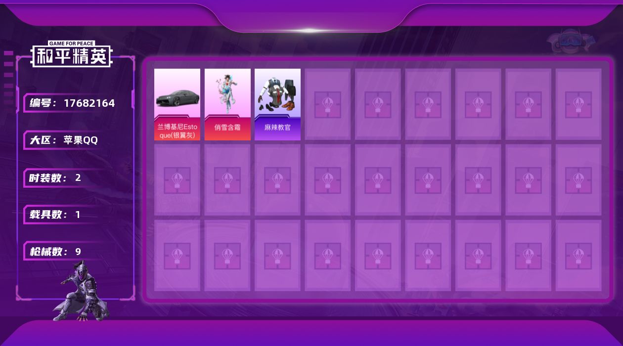 - [17385922]164m总资产-92764k哈伏币-60烽火等级-钻石-10战场等级-列兵 【干员外观】:威龙-凌霄戍卫 【近战皮肤】:近战-黑鹰 【传说外观】:QBZ95-1突击步枪-凌霄戍卫,腾龙突击步枪-马年祥瑞,腾龙突击步枪-万金泪冠,SR-3M紧凑突击步枪-荼蘼,勇士冲锋枪-万金泪冠,M14射手步枪-缄花,SKS射手步枪-骑士,AWM狙击步枪-万金泪冠,G18-马年祥瑞 【史诗外观】:K416突击步枪-冬日风情,SG552突击步枪-深海恐惧,SG552突击步枪-哈夫克警备,SCAR-H战斗步枪-囚徒,MP5冲锋枪-竞技风,MP7冲锋枪-六套之力,PKM通用机枪-蝮蛇,PKM通用机枪-阿萨拉特攻,QJB201轻机枪-炽焰,SVD狙击步枪-阿萨拉工艺,M14射手步枪-工业狂潮,M700狙击步枪-哈夫克警备 【稀有外观】:AKM突击步枪-肃杀,K416突击步枪-一帆风顺,SG552突击步枪-2026,SG552突击步枪-贴花艺术,Vector冲锋枪-先锋,SMG-45冲锋枪-幻影结构,勇士冲锋枪-冰天雪地,M249轻机枪-毛鲁斯之力,M249轻机枪-冰天雪地,QJB201轻机枪-哈夫克卫队,Mini-14射手步枪-荣耀列队,SR-25射手步枪-开拓,SR-25射手步枪-行动开启 【普通外观】:M4A1突击步枪-粉色涂装,M4A1突击步枪-海色,QBZ95-1突击步枪-高雅黑,QBZ95-1突击步枪-海浪,QBZ95-1突击步枪-海色,QBZ95-1突击步枪-2026,K416突击步枪-几何迷彩,K416突击步枪-高雅黑,M16A4突击步枪-高雅黑,AUG突击步枪-浅蓝涂装,SG552突击步枪-浅蓝涂装,SG552突击步枪-海浪,SCAR-H战斗步枪-数码迷彩,G3战斗步枪-高雅黑,PTR-32突击步枪-黄蜂,MP5冲锋枪-海色,MP5冲锋枪-黄蜂,Vector冲锋枪-几何迷彩,UZI冲锋枪-海色,野牛冲锋枪-高雅黑,M1014霰弹枪-高雅黑,M1014霰弹枪-重击,M249轻机枪-黄蜂,M250通用机枪-雪松,QJB201轻机枪-典雅,SVD狙击步枪-高雅黑,SKS射手步枪-三角洲力量,SR-25射手步枪-黄蜂,PSG-1射手步枪-雪松,SV-98狙击步枪-红色涂装,沙漠之鹰-海浪,沙漠之鹰-高雅黑,G17-2026 【载具外观】:M1A4坦克-驯鹿 【挂饰】:挂饰-黑夜猎手