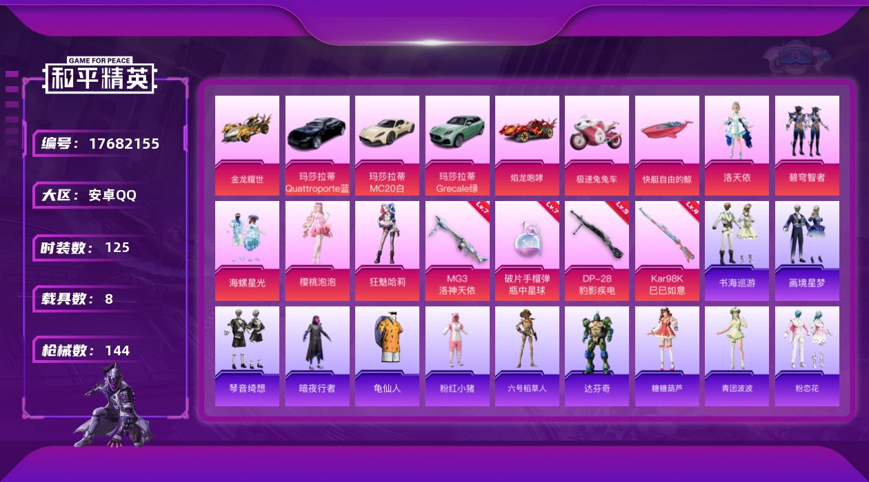 [17682155]【特价出售/店主推荐】安卓 手Q-5粉装-9特效枪-8载具-1粉色飞行器-55004热力值-8王牌印记-125套装-144枪皮【热门品类】:套装-暗夜行者,套装-龟仙人,套装-粉红小猪,角色-六号稻草人【粉色套装】:角色-洛天依,粉装-碧穹智者,粉装-海螺星光,角色-樱桃泡泡,角色-狂魅哈莉【粉色枪皮等级】:ACE32-萌骑漫游(三级),UMP45-萌骑冒险(一级),AKS-74U-森灵之息(五级),Kar98K-巳巳如意(四级),Mk14-福马献瑞(五级),M417-绛云霓裳(三级),DP-28-豹影疾电(五级),MG3-洛神天依(七级),破片手榴弹-瓶中星球(七级)【粉色载具】:玛莎拉蒂MC20(星石白),玛莎拉蒂Quattroporte(夜幕蓝),玛莎拉蒂Grecale(薄荷绿),焰龙咆哮,金龙耀世,极速兔兔车,僚机-萌兔起飞,快艇-自由的鲸【粉色枪皮】:ACE32-萌骑漫游,UMP45-萌骑冒险,AKS-74U-森灵之息,Kar98K-巳巳如意,Mk14-福马献瑞,M417-绛云霓裳,DP-28-豹影疾电,MG3-洛神天依,破片手榴弹-瓶中星球【粉色飞行器】:炫彩糖果飞行器