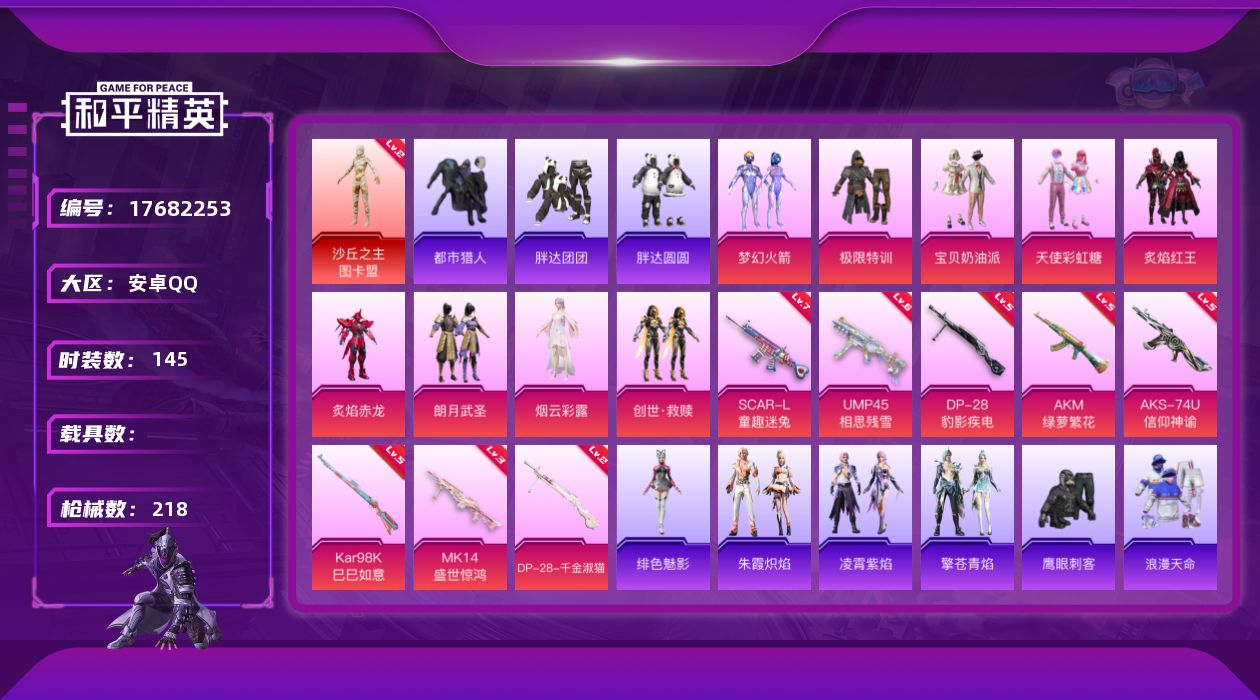 [17682253]不包脸【特价出售/店主推荐】安卓 手Q-1神装-9粉装-8特效枪-0载具-3粉色飞行器-63373热力值-9王牌印记-145套装-218枪皮