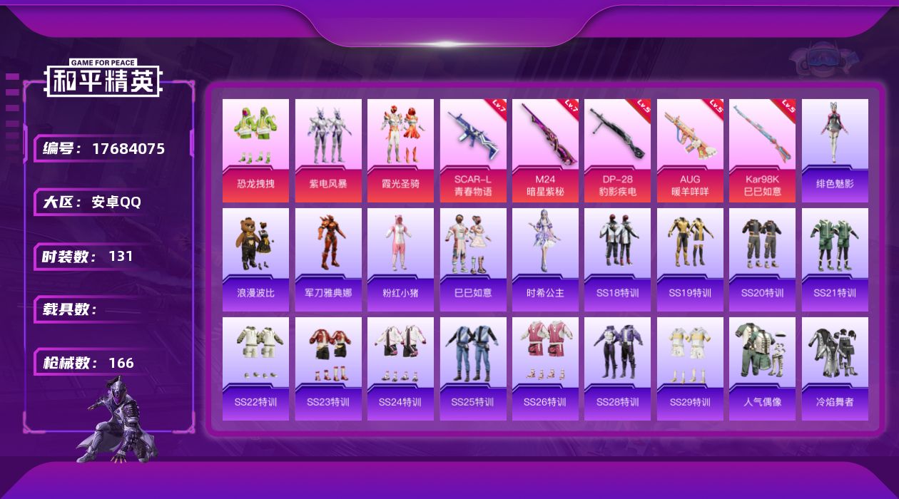 [17684075]安卓 手Q-4粉装-6特效枪-0载具-2粉色飞行器-52125热力值-15王牌印记-131套装-166枪皮 【热门品类】:角色-军刀雅典娜,套装-浪漫波比,套装-粉红小猪 【粉色套装】:粉装-恐龙拽拽,粉装-紫电风暴,粉装-霞光圣骑,角色-罪夜之冕 【粉色枪皮等级】:SCAR-L-青春物语(七级),AUG-暖羊咩咩(五级),Kar98K-巳巳如意(五级),M24-暗星紫秘(七级),Mk14-福马献瑞(四级),DP-28-豹影疾电(五级) 【粉色枪皮】:SCAR-L-青春物语,AUG-暖羊咩咩,Kar98K-巳巳如意,M24-暗星紫秘,Mk14-福马献瑞,DP-28-豹影疾电 【粉色飞行器】:炫彩糖果飞行器,冷魅冰骑飞行器 【粉色降落伞】:流星咚咚降落伞,暗星紫秘降落伞,恐龙拽拽降落伞,橘柚倾心降落伞,筑梦精灵降落伞,炙焰牛王降落伞,环太平洋降落伞,盛世惊鸿降落伞,晶梦幻蝶降落伞,绯穹魔姬降落伞,炫彩糖果降落伞,虎痴许褚降落伞 【稀有套装】:套装-巳巳如意,套装-炫彩糖果,角色-时希公主,角色-绯色魅影 【稀有枪皮】:AKM-彩虹符号,AKM-灼热熔岩,AKM-环太平洋,AKM-破晓战魂,AKM-筑梦精灵,AKM-龙的传人,M16A4-甜心亚梦,SCAR-L-夜灯,SCAR-L-玉兔迎春,SCAR-L-红色方程式,M416-暗星紫秘,M416-糯团青竹,M416-红色方程式,GROZA-异彩先驱,AUG-天降萌叽,AUG-耀粉歌者,AUG-青春冒险家,QBZ-妙趣可丽,QBZ-飞驰魅影,M762-天降萌叽,G36C-冷魅冰骑,AC-VAL-天降萌叽,AC-VAL-甜心亚梦,蜜獾-天降萌叽,蜜獾-娇憨猪猪,ACE32-蓝晶绮麟,UZI-天降萌叽,UZI-娇憨猪猪,UZI-影袭,UZI-红色方程式,UMP45-夜灯,UMP45-春暖花开,UMP45-涂山之恋,UMP45-生命誓言,Vector-生命誓言,汤姆逊-天降萌叽,汤姆逊-异彩先驱,汤姆逊-环太平洋,MP5K-异彩先驱,MP5K-蓝莓炮弹,AKS-74U-鬼刀,P90-筑梦精灵,P90-飞驰魅影,P90-巳巳如意,Kar98K-飞驰魅影,M24-炫彩节奏,SKS-糯团青竹,VSS-彩虹符号,Mini14-异彩先驱,Mini14-炫彩节奏,Mini14-筑梦精灵,Mini14-耀粉歌者,Mk14-暗星紫秘,SLR-