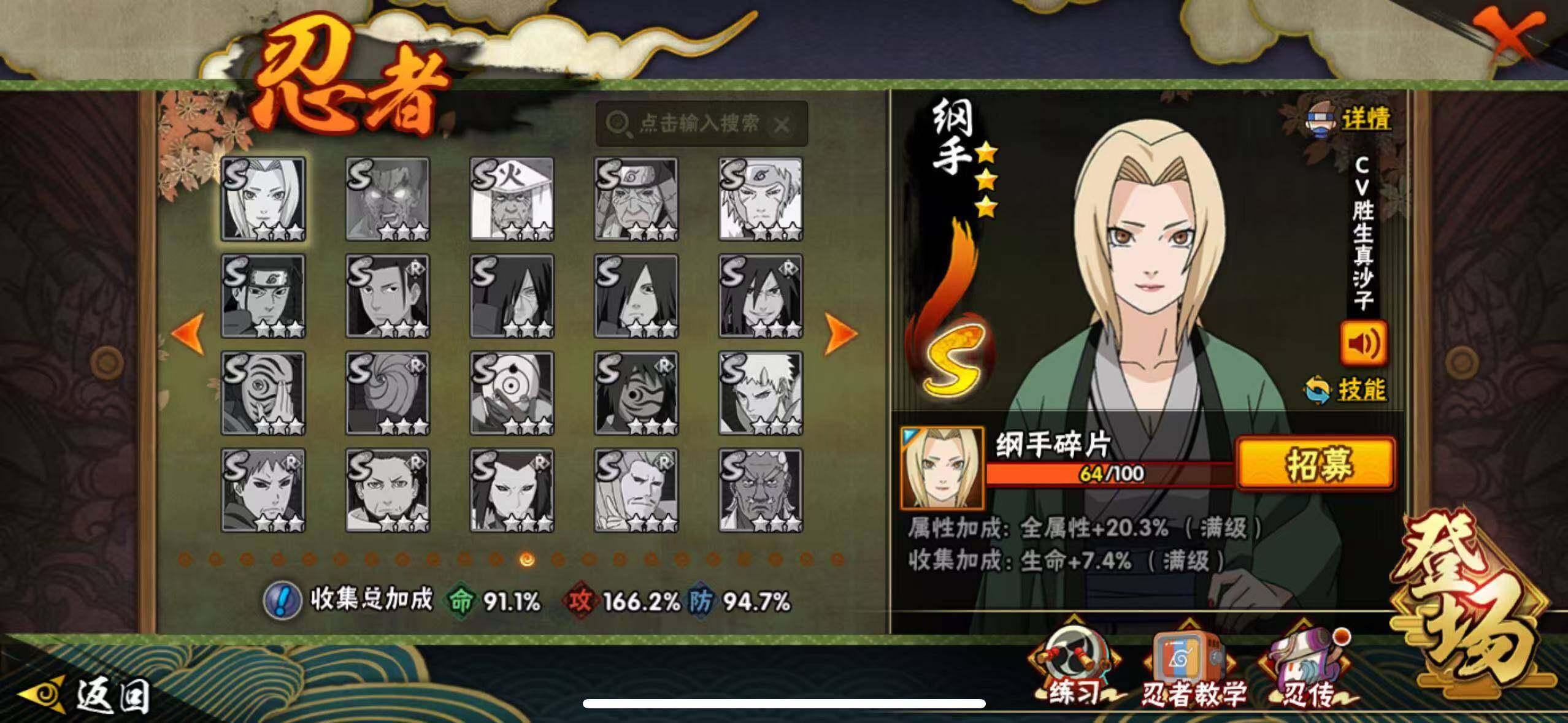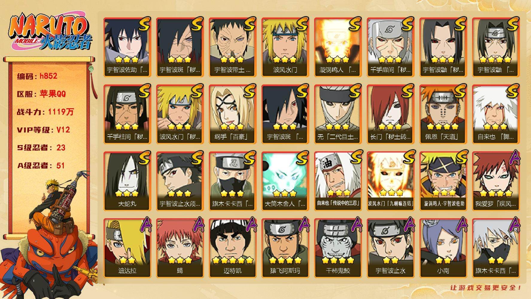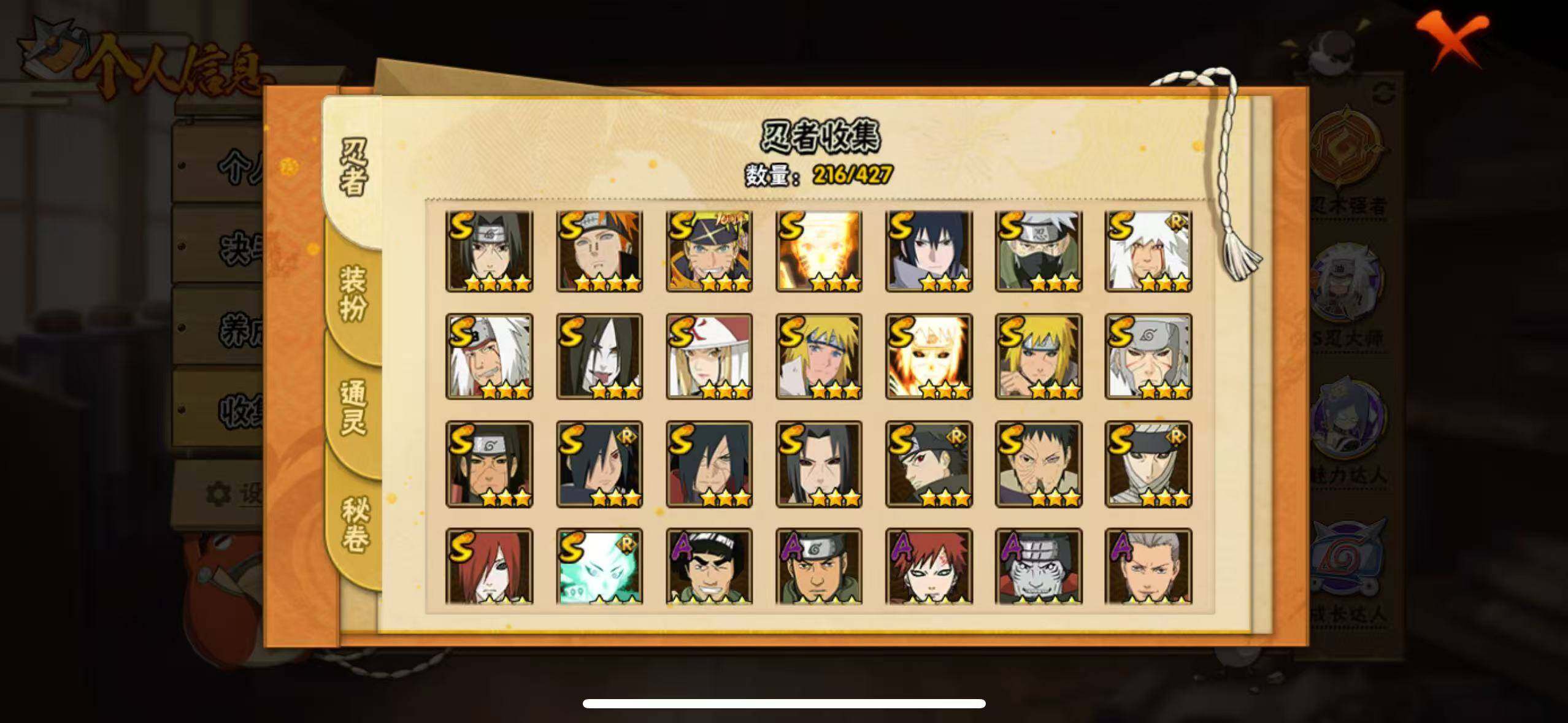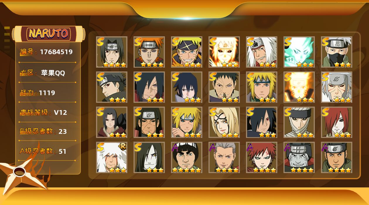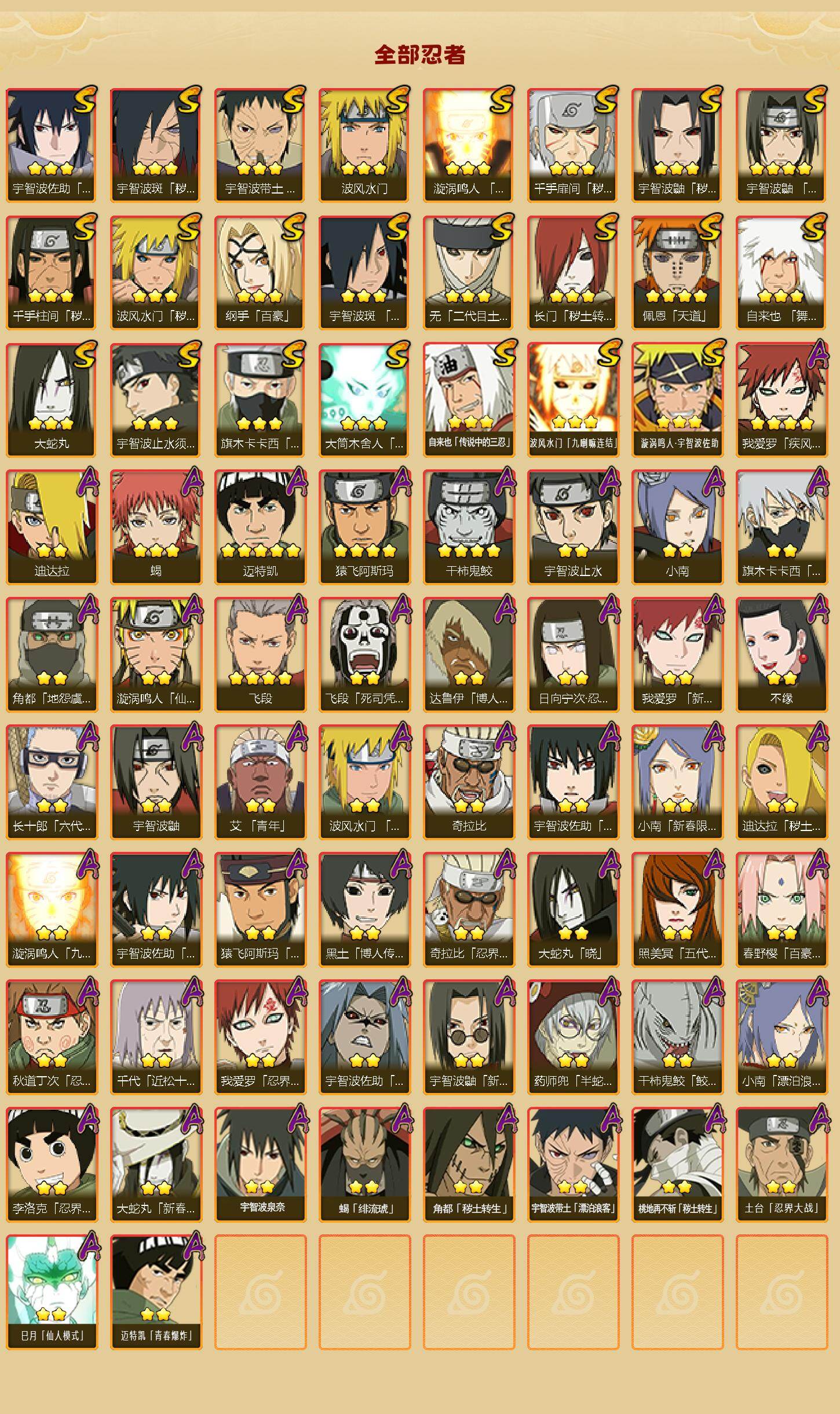 【S级忍者】:长门「秽土转生」(3星),波风水门「秽土转生」(3星),千手扉间「秽土转生」(3星),千手柱间「秽土转生」(3星),宇智波鼬「秽土转生」(3星),宇智波斑「秽土转生·解」(3星),宇智波带土「忍界大战」(3星),宇智波鼬「须佐能乎」(4星),宇智波止水「须佐能乎」(3星),旗木卡卡西「须佐能乎」(3星),宇智波斑「木叶创立」(3星),无「二代目土影」(3星),自来也「舞之豪杰」(3星),大蛇丸(3星),自来也「传说中的三忍」(3星),纲手「百豪」(3星),波风水门(3星),漩涡鸣人「九喇嘛连结」(3星),佩恩「天道」(4星),宇智波佐助「永恒万花筒」(3星),大筒木舍人「最终章」(3星),波风水门「九喇嘛连结」(3星),漩涡鸣人·宇智波佐助(3星)