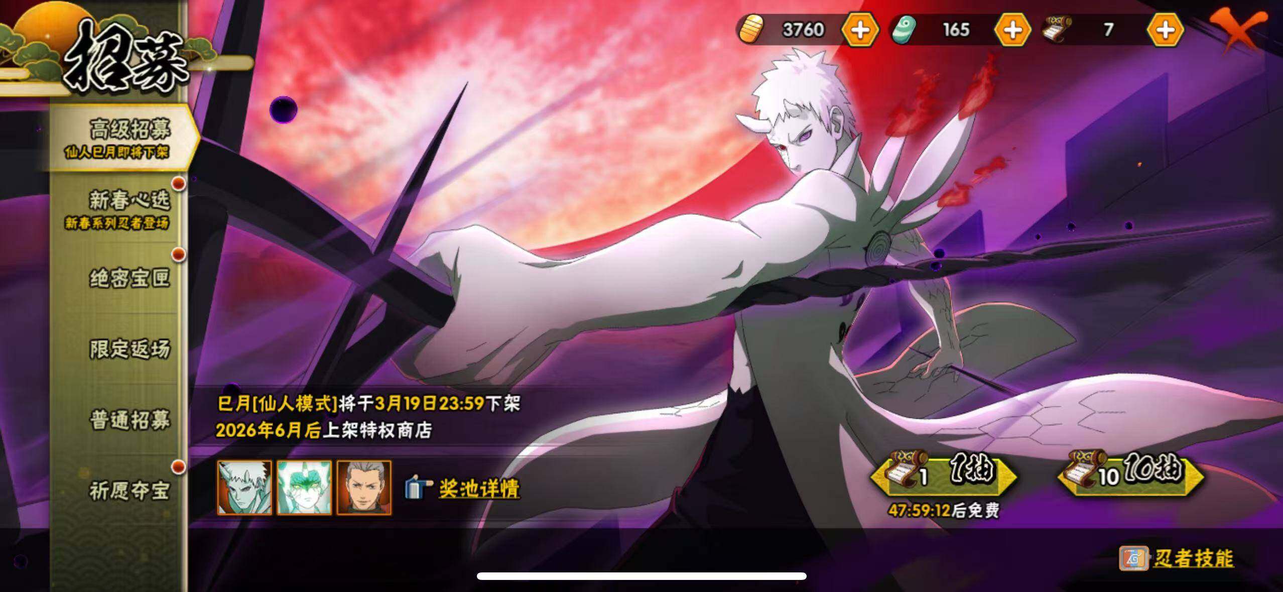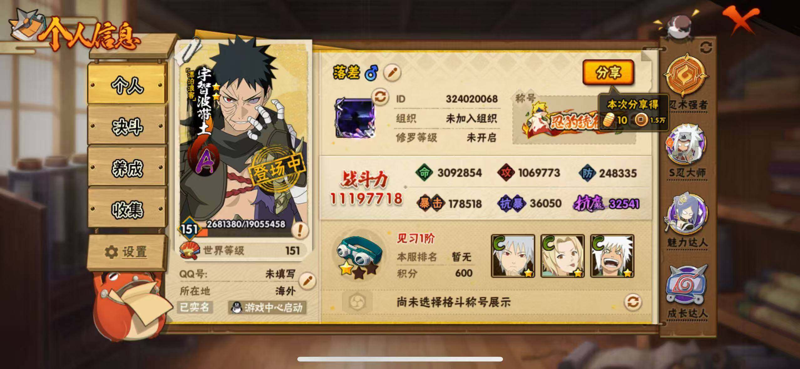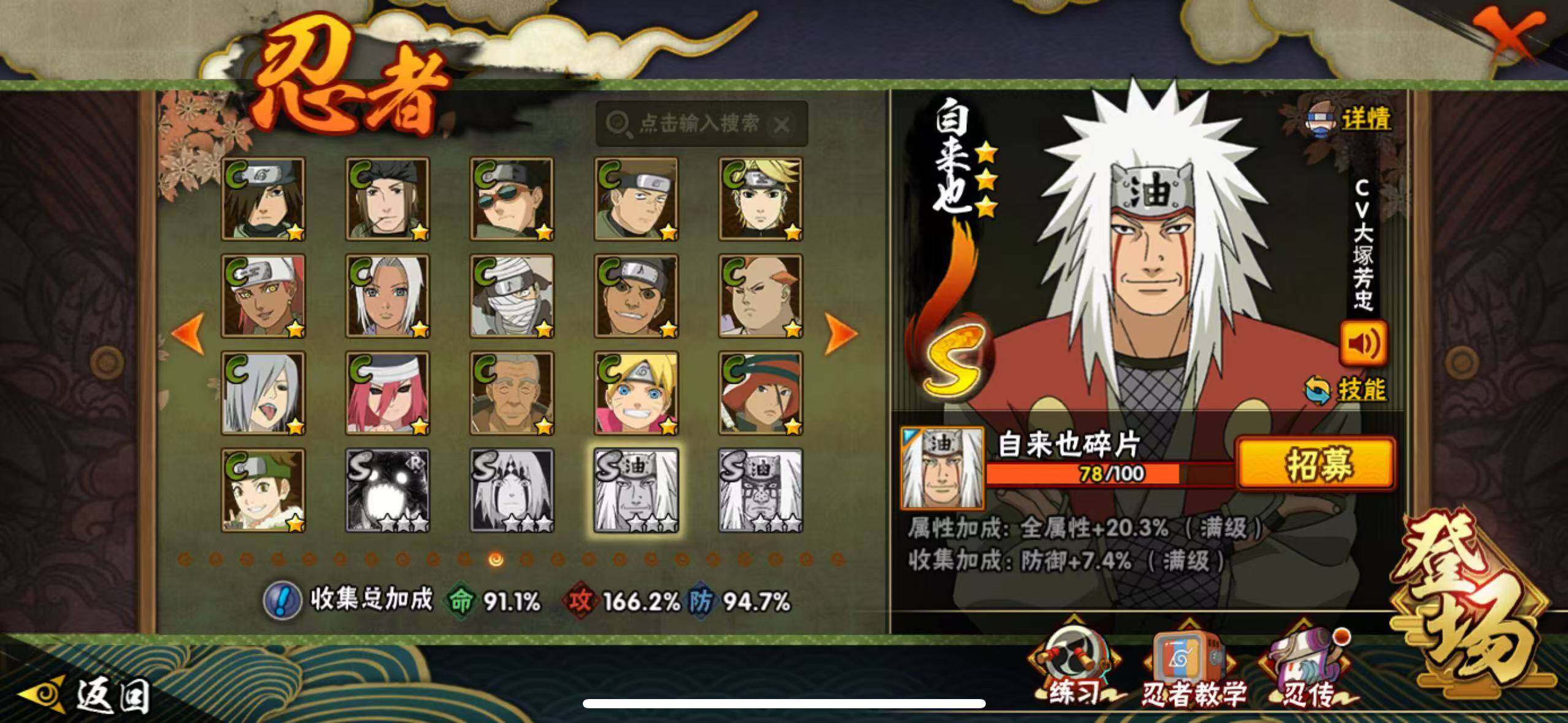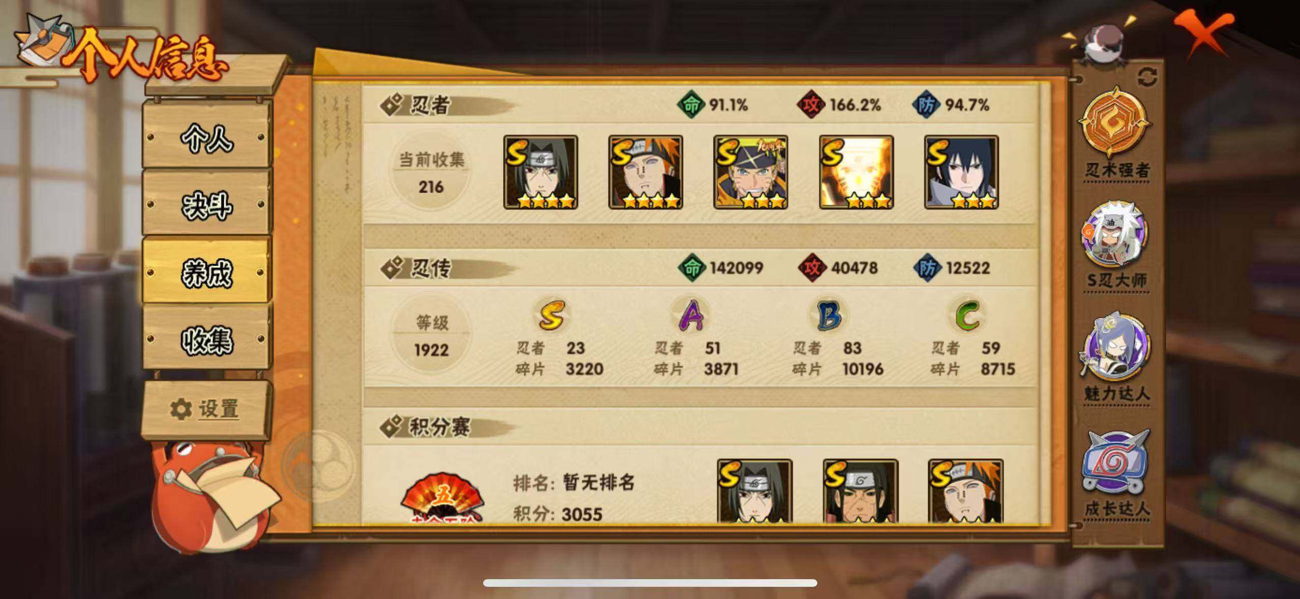 【S级忍者】:长门「秽土转生」(3星),波风水门「秽土转生」(3星),千手扉间「秽土转生」(3星),千手柱间「秽土转生」(3星),宇智波鼬「秽土转生」(3星),宇智波斑「秽土转生·解」(3星),宇智波带土「忍界大战」(3星),宇智波鼬「须佐能乎」(4星),宇智波止水「须佐能乎」(3星),旗木卡卡西「须佐能乎」(3星),宇智波斑「木叶创立」(3星),无「二代目土影」(3星),自来也「舞之豪杰」(3星),大蛇丸(3星),自来也「传说中的三忍」(3星),纲手「百豪」(3星),波风水门(3星),漩涡鸣人「九喇嘛连结」(3星),佩恩「天道」(4星),宇智波佐助「永恒万花筒」(3星),大筒木舍人「最终章」(3星),波风水门「九喇嘛连结」(3星),漩涡鸣人·宇智波佐助(3星)