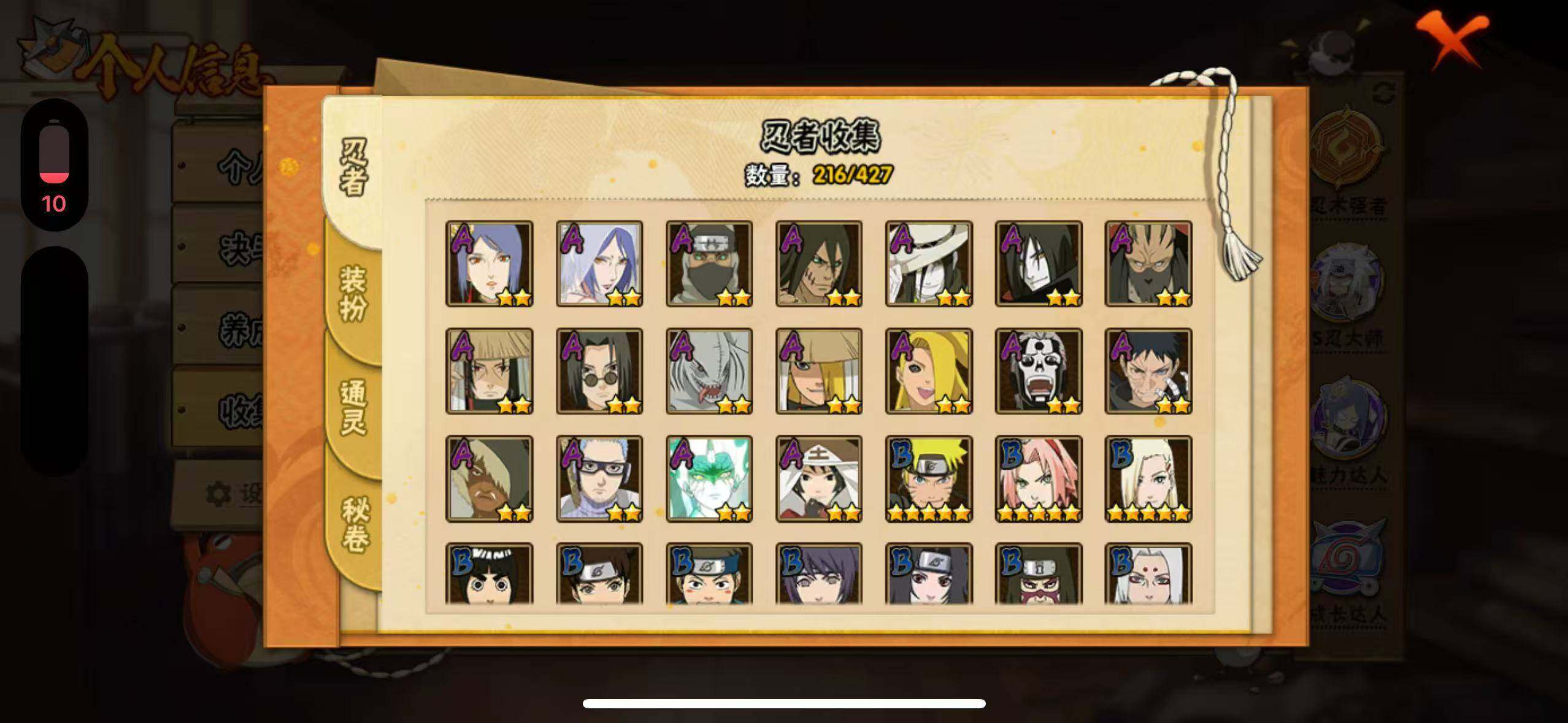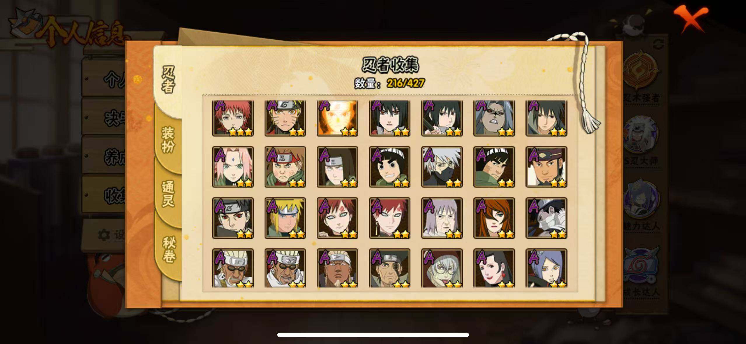 【A级忍者】:艾「青年」(2星),波风水门「青年」(2星),达鲁伊「博人传」(2星),迪达拉(2星),迪达拉「秽土转生」(2星),大蛇丸「晓」(2星),大蛇丸「新春限定」(2星),奇拉比(2星),奇拉比「忍界大战」(2星),飞段(4星),飞段「死司凭血」(2星),干柿鬼鲛(4星),干柿鬼鲛「鲛肌融合」(2星),漩涡鸣人「仙人模式」(2星),漩涡鸣人「九尾查克拉」(2星),迈特凯(5星),旗木卡卡西「万花筒写轮眼」(2星),桃地再不斩「秽土转生」(2星),我爱罗「疾风传」(4星),我爱罗「新春限定」(2星),我爱罗「忍界大战」(2星),蝎(3星),蝎「绯流琥」(2星),小南(2星),小南「新春限定」(2星),小南「漂泊浪客」(2星),角都「地怨虞」(2星),角都「秽土转生」(2星),猿飞阿斯玛(4星),猿飞阿斯玛「七夕限定」(2星),宇智波止水(2星),宇智波鼬(2星),宇智波鼬「新春限定」(2星),宇智波佐助「须佐能乎」(2星),宇智波佐助「疾风传咒印」(2星),宇智波佐助「万花筒写轮眼」(2星),药师兜「半蛇斗篷」(2星),照美冥「五代目水影」(2星),日向宁次「忍界大战」(2星),宇智波带土「漂泊浪客」(2星),长十郎「六代目水影」(2星),李洛克「忍界大战」(2星),黑土「博人传」(2星),春野樱「百豪」(2星),秋道丁次「忍界大战」(2星),千代「近松十人卫」(2星),土台「忍界大战」(2星),不缘(2星),宇智波泉奈(2星),巳月「仙人模式」(2星),迈特凯「青春