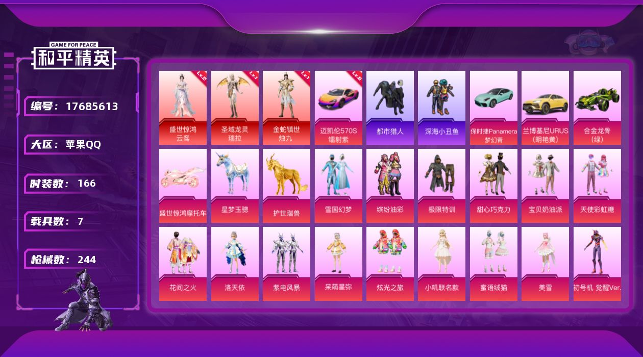 [17685613]【特价出售/店主推荐】苹果 手Q-3神装-16粉装-25特效枪-7载具-7粉色飞行器-100749热力值-11王牌印记-166套装-244枪皮 【红色载具】:迈凯伦570S(镭射紫)(六级) 【红色神装等级】:圣域龙灵-瑞拉(一级),金蛇镇世-烛九(一级),盛世惊鸿-云鸾(二级) 【红色角色神装】:圣域龙灵-瑞拉,金蛇镇世-烛九,盛世惊鸿-云鸾 【热门品类】:粉装-雪国幻梦,粉装-缤纷油彩,套装-浪漫天命,套装-都市猎人,套装-深海小丑鱼,套装-小丑鱼,套装-暗影哥特,角色-8号机,角色-Mark.06 【粉色套装】:粉装-极限特训,粉装-甜心巧克力,粉装-宝贝奶油派,粉装-天使彩虹糖,粉装-雪国幻梦,粉装-缤纷油彩,粉装-花间之火,角色-洛天依,粉装-紫电风暴,角色-呆萌星弥,粉装-炫光之旅,角色-小叽联名款,粉装-蜜语绒猫,角色-美雪,角色-初号机 觉醒Ver.,粉装-幻彩电音 【粉色枪皮等级】:AKM-梦之光华(五级),SCAR-L-纯梦嫁纱(四级),SCAR-L-锦绣绵绵(五级),SCAR-L-金蛇镇世(三级),M416-心之恋语(六级),M416-墨龙九天(三级),GROZA-巴啦啦小魔仙(五级),AUG-星梦奇缘(六级),M762-冷魅冰骑(四级),Famas-初号机 觉醒Ver.(四级),ACE32-萌骑漫游(一级),UMP45-量子极限(五级),UMP45-宇宙意志(三级),AKS-74U-森灵之息(五级),P90-能量风暴(四级),Kar98K-巳巳如意(五级),Kar98K-圣域龙灵(三级),Mk14-精灵梦叶罗丽(四级),Mk14-盛世惊鸿(三级),Mk14-福马献瑞(五级),AMR-炫光之旅(四级),DP-28-豹影疾电(五级),MG3-洛神天依(五级),MG-36-幻彩电音(四级),烟雾弹-丁香清露(四级) 【粉色载具】:迈凯伦570S(镭射紫),兰博基尼URUS(明艳黄),保时捷Panamera(梦幻青),合金龙骨(绿),盛世惊鸿摩托车,星梦玉骢,护世瑞兽 【粉色枪皮】:AKM-梦之光华,SCAR-L-纯梦嫁纱,SCAR-L-锦绣绵绵,SCAR-L-金蛇镇世,M416-心之恋语,M416-墨龙九天,GROZA-巴啦啦小魔仙,AUG-星梦奇缘,M762-冷魅冰骑,Famas-初号机 觉醒Ver.,ACE32-萌骑漫游,UMP45-量子极限