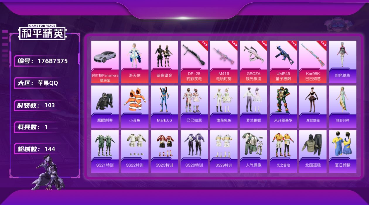 [17687375]苹果 手Q-2粉装-6特效枪-1载具-1粉色飞行器-42542热力值-10王牌印记-103套装-144枪皮 【热门品类】:套装-小丑鱼,角色-Mark.06 【粉色套装】:角色-洛天依,粉装-暗夜鎏金 【粉色枪皮等级】:M416-电玩时刻(五级),GROZA-镜光银凌(五级),UMP45-量子极限(五级),Kar98K-巳巳如意(五级),Mk14-福马献瑞(五级),DP-28-豹影疾电(五级) 【粉色载具】:保时捷Panamera(星辰紫) 【粉色枪皮】:M416-电玩时刻,GROZA-镜光银凌,UMP45-量子极限,Kar98K-巳巳如意,Mk14-福马献瑞,DP-28-豹影疾电 【粉色飞行器】:炫彩糖果飞行器 【粉色降落伞】:怪笑疯兔降落伞,垂柳戏鸭降落伞,彩虹甜喵降落伞,第五大道降落伞,精灵梦叶罗丽降落伞,创世·救赎降落伞,星穹咏叹调降落伞,无垠阁降落伞,异瞳寒姬降落伞,炫彩糖果降落伞 【稀有套装】:套装-巳巳如意,套装-雪国风尚,套装-炫彩糖果,套装-马上有钱,套装-雏菊兔兔,套装-萝兰蝴蝶,角色-米开朗基罗,角色-摩登魅猫,角色-猎影月神,角色-绯色魅影,套装-雨过天青,套装-红釉青花 【稀有枪皮】:AUG-冰晶雪宝,AKM-夜灯,AKM-彩虹符号,AKM-影袭,AKM-破晓战魂,AKM-萌趣颜团子,AKM-龙的传人,M16A4-幻世战舞者,M16A4-红色方程式,SCAR-L-炫彩节奏,SCAR-L-玉兔迎春,M416-红色方程式,M416-蓝色火焰,GROZA-彩虹符号,GROZA-田园牧歌,AUG-耀粉歌者,M762-天降萌叽,M762-彩虹符号,G36C-炙焰牛王,AC-VAL-天降萌叽,AC-VAL-彩虹甜喵,蜜獾-千面幻镜,蜜獾-垂柳戏鸭,蜜獾-天降萌叽,蜜獾-娇憨猪猪,Famas-墨龙九天,UZI-啾咪啾咪,UZI-娇憨猪猪,UZI-影袭,UZI-炫彩节奏,UZI-红色方程式,UZI-月影灵韵,UMP45-夜灯,UMP45-蓝色火焰,UMP45-诡娃娃,Vector-彩虹符号,Vector-生命誓言,Vector-田园牧歌,汤姆逊-天降萌叽,汤姆逊-耀粉歌者,汤姆逊-像素花束,P90-巳巳如意,Kar98K-影袭,Kar98K-王子的夏天,M24-炫彩节奏,AWM-垂柳戏鸭,SKS-炫彩节奏,VSS-田园牧歌,Mini14-旋转彩虹,Mi