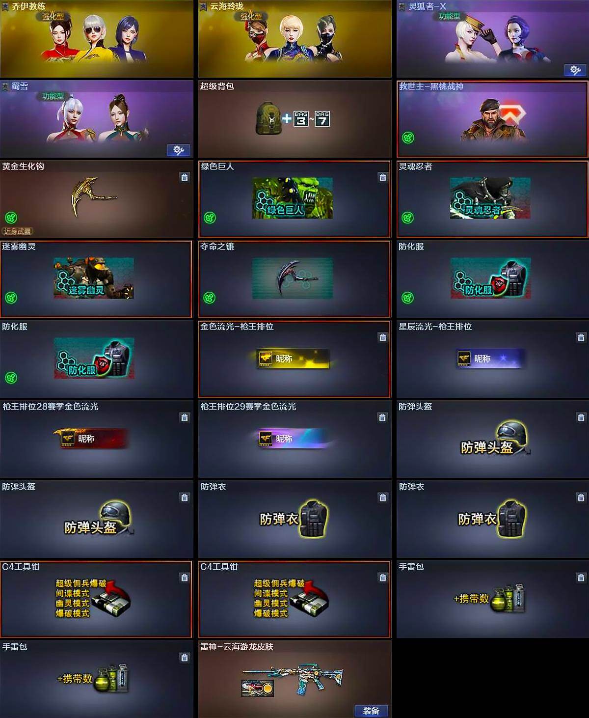【道具】:超级背包,救世主-黑桃战神,黄金生化钩,绿色巨人,灵魂忍者,迷雾幽灵,夺命之镰,防化服*2,金色流光-枪王排位,星辰流光-枪王排位,枪王排位28赛季金色流光,枪王排位29赛季金色流光,防弹头盔*2,防弹衣*2,C4工具钳*2,手雷包*2
