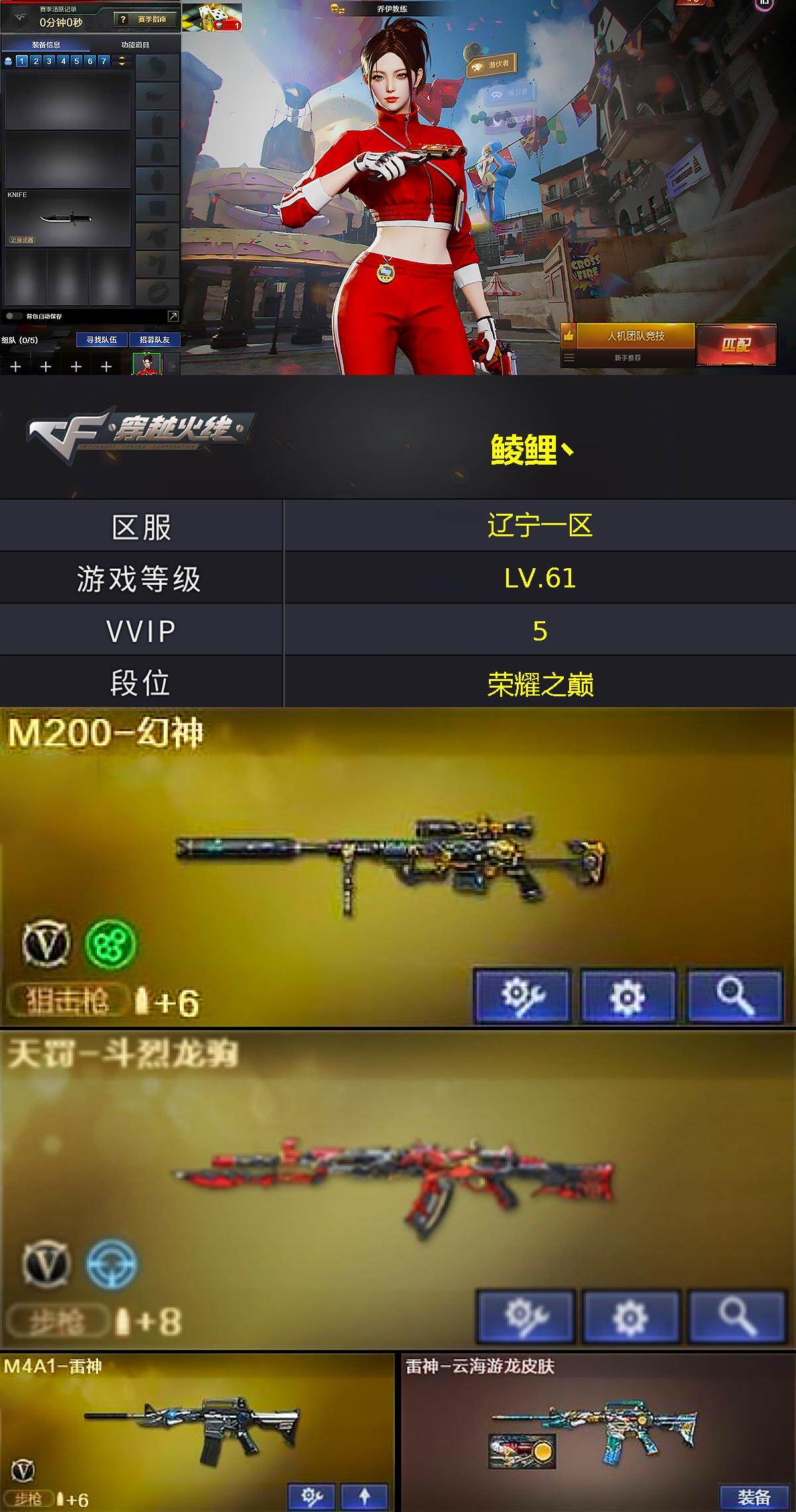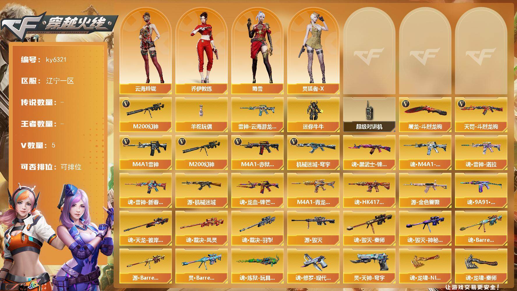 [17675712]【ky6321】辽宁一区-6V-0王者武器数-0炫金武器数 【热门武器】:M200-幻神,羊驼玩偶 【皮肤】:雷神-云海游龙皮肤 【角色】:乔伊教练,云海玲珑,灵狐者-X,蜀雪 【人偶武器】:迷你牛牛*2 【暴走生化】:超级对讲机 【英雄级武器】:M4A1-雷神,机械迷城-穹宇,天罚-斗烈龙驹,M200-幻神,屠龙-斗烈龙驹,M4A1-赤狱骑士 【源级武器】:魂·M4A1-雷神-化蛇,魂·雷神-诺拉,魂·雷神-新春神龙*2,魂·黑武士-锋芒破茧,源·机械迷城,魂·龙血-锋芒破茧,M4A1-青龙-掌上穿越火线,魂·HK417-朱雀-凤灵,源-金色蔷薇*2,魂·9A91·烈火-电子连击,源·玫瑰精灵,魂·天龙-彼岸花,魂·裁决-凤灵,魂·裁决-羽掣,源·毁灭,魂·毁灭-秦师,魂·毁灭-神秘黑洞*2,魂·Barrett-朱雀- 新春神龙,源·Barrett-朱雀,灵·Barrett-朱雀-炫光*2,魂·炼狱-玩具枪,魂·修罗-现代金属,灵·天神-穹宇,魂·龙啸-NICE,魂·龙啸-秦师,灵·麒麟刺-穹宇 【道具】:超级背包,救世主-黑桃战神,黄金生化钩,绿色巨人,灵魂忍者,迷雾幽灵,夺命之镰,防化服*2,金色流光-枪王排位,星辰流光-枪王排位,枪王排位28赛季金色流光,枪王排位29赛季金色流光,防弹头盔*2,防弹衣*2,C4工具钳*2,手雷包*2 【特殊枪械】: