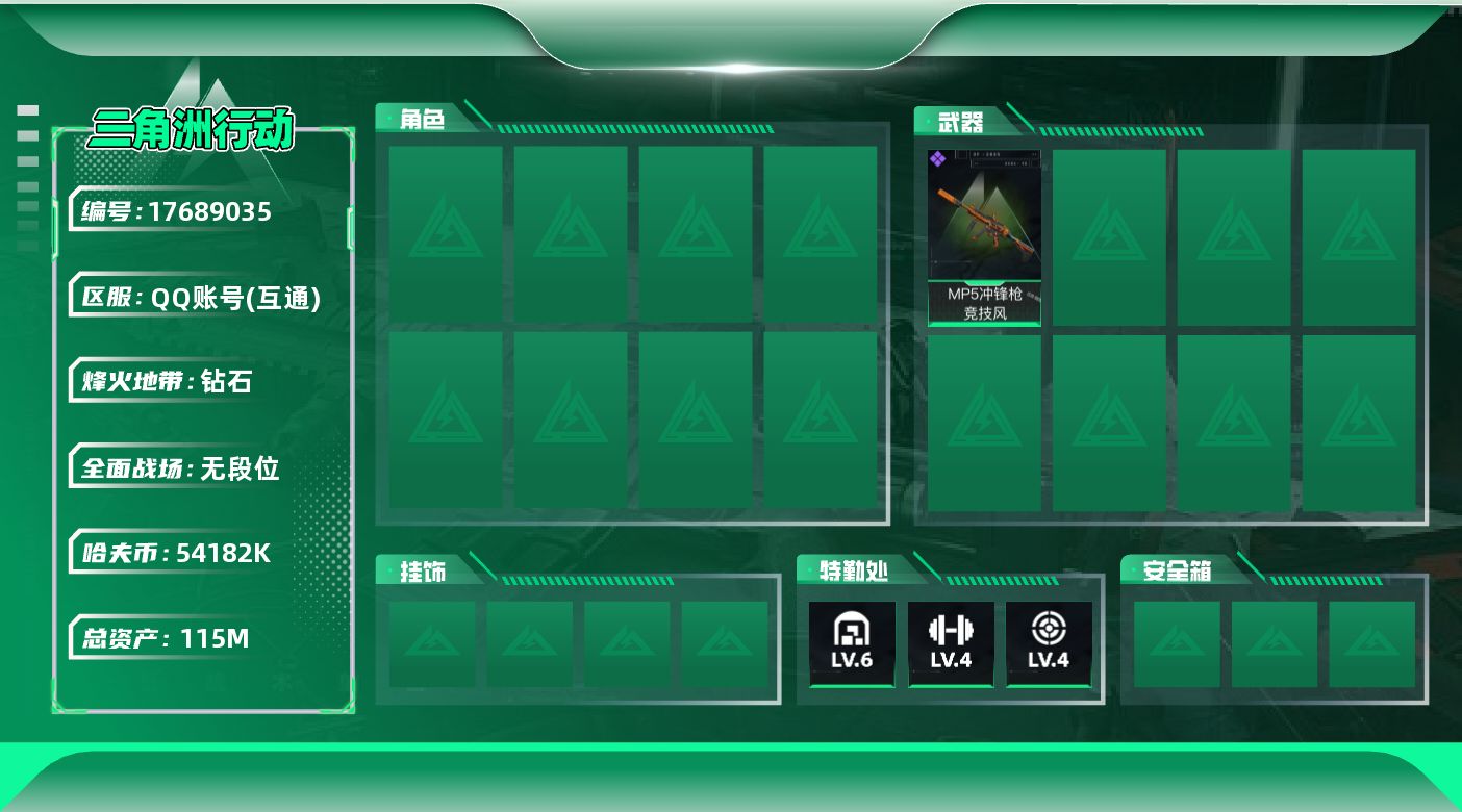 [17689035]【店主推荐捡漏号!可直接换绑】115m总资产-54182k哈伏币-50烽火等级-钻石-1战场等级-无军衔 【近战皮肤】:近战-黑鹰 【史诗外观】:MP5冲锋枪-竞技风 【稀有外观】:AKM突击步枪-肃杀,腾龙突击步枪-冰天雪地,UZI冲锋枪-亚特兰蒂斯,SMG-45-行动开启 【普通外观】:M4A1突击步枪-高雅黑,M4A1突击步枪-海色,QBZ95-1突击步枪-高雅黑,K416突击步枪-几何迷彩,M16A4突击步枪-高雅黑,SCAR-H战斗步枪-红色涂装,G3战斗步枪-高雅黑,M1014霰弹枪-海浪,SVD狙击步枪-高雅黑,沙漠之鹰-高雅黑 【军牌】:军牌-修整,军牌-信誉优秀 【挂饰】:挂饰-暗行哨兵