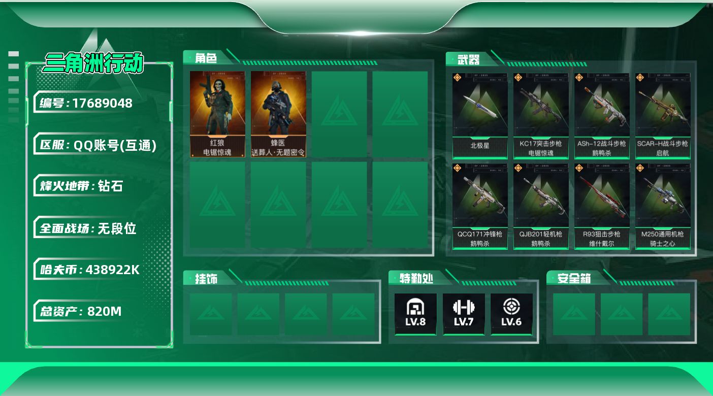[17689048]【店主推荐捡漏单】820m总资产-438922k哈伏币-60烽火等级-钻石-1战场等级-无军衔 【干员外观】:蜂医-送葬人·无题密令,红狼-电锯惊魂 【近战皮肤】:近战-北极星,近战-黑鹰 【传说外观】:M4A1突击步枪-蚀金玫瑰,M4A1突击步枪-阿米娅,ASh-12战斗步枪-鹅鸭杀,AK-12突击步枪-特斯拉线圈,SCAR-H战斗步枪-启航,CAR-15突击步枪-阿米娅,腾龙突击步枪-捞点薯条,K437突击步枪-北极星,KC17突击步枪-电锯惊魂,UZI冲锋枪-特斯拉线圈,SR-3M紧凑突击步枪-特斯拉线圈,勇士冲锋枪-能天使-午夜邮差,QCQ171冲锋枪-北极星,QCQ171冲锋枪-鹅鸭杀,725双管霰弹枪-送葬人-无题密令,M250通用机枪-骑士之心,QJB201轻机枪-鹅鸭杀,R93狙击步枪-维什戴尔,AWM狙击步枪-捞点薯条,93R-捞点薯条 【史诗外观】:ASh-12战斗步枪-无极限,M16A4突击步枪-竞赛选手,AUG突击步枪-蝮蛇,SCAR-H战斗步枪-囚徒,AS Val突击步枪-典狱官,腾龙突击步枪-无垢,K437突击步枪-守护者,MP5冲锋枪-深海恐惧,MP5冲锋枪-战术竞备,MP5冲锋枪-竞技风,Vector冲锋枪-猎鳄行动,SR-3M紧凑突击步枪-荒野求生,SR-3M紧凑突击步枪-战术竞备,MP7冲锋枪-无垢,MP7冲锋枪-守护者,S12K霰弹枪-曙光,PKM通用机枪-荒野求生,M250通用机枪-囚徒,Mini-14射手步枪-守护者,SVD狙击步枪-荒野求生,PSG-1射手步枪-无垢,SV-98狙击步枪-林中猎手,SV-98狙击步枪-囚徒,AWM狙击步枪-无极限,复合弓-守护者 【稀有外观】:R93狙击步枪-精湛工艺,AKM突击步枪-战术演练,AKM突击步枪-肃杀,QBZ95-1突击步枪-公平竞技,AKS-74U突击步枪-前沿科技,K416突击步枪-虎啸,M7战斗步枪-捣蛋鬼,SCAR-H战斗步枪-荣耀列队,SCAR-H战斗步枪-黄昏,G3战斗步枪-战术演练,G3战斗步枪-主宰,CAR-15突击步枪-前沿科技,腾龙突击步枪-雪崩,腾龙突击步枪-冰天雪地,MP5冲锋枪-弄臣,MP5冲锋枪-虎啸,MP5冲锋枪-哈夫克卫队,P90冲锋枪-黄昏,P90冲锋枪-捣蛋鬼,Vector冲锋枪-先锋,UZI冲锋枪-前沿科技,UZI冲锋枪-亚特兰蒂斯,SM