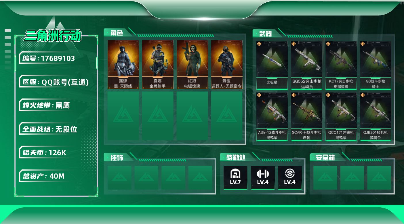 [17689103]可二次【店主推荐捡漏号!可直接换绑】40m总资产-126k哈伏币-60烽火等级-黑鹰-1战场等级-无军衔 【干员外观】:露娜-黑·天际线,蜂医-送葬人·无题密令,红狼-电锯惊魂,露娜-金牌射手 【近战皮肤】:近战-北极星,近战-黑鹰 【传说外观】:M4A1突击步枪-蚀金玫瑰,M4A1突击步枪-阿米娅,ASh-12战斗步枪-鹅鸭杀,SG552突击步枪-运动员,AK-12突击步枪-特斯拉线圈,SCAR-H战斗步枪-启航,G3战斗步枪-骑士,CAR-15突击步枪-阿米娅,腾龙突击步枪-捞点薯条,K437突击步枪-北极星,KC17突击步枪-电锯惊魂,Vector冲锋枪-能天使-午夜邮差,UZI冲锋枪-特斯拉线圈,SR-3M紧凑突击步枪-特斯拉线圈,勇士冲锋枪-能天使-午夜邮差,QCQ171冲锋枪-北极星,QCQ171冲锋枪-鹅鸭杀,725双管霰弹枪-送葬人-无题密令,M250通用机枪-骑士之心,QJB201轻机枪-鹅鸭杀,AWM狙击步枪-捞点薯条,93R-捞点薯条,复合弓-黑·天际线 【史诗外观】:ASh-12战斗步枪-无极限,M16A4突击步枪-竞赛选手,AUG突击步枪-蝮蛇,M7战斗步枪-百步穿杨,SCAR-H战斗步枪-囚徒,G3战斗步枪-流沙送葬,AS Val突击步枪-百步穿杨,腾龙突击步枪-无垢,K437突击步枪-守护者,MP5冲锋枪-战术竞备,MP5冲锋枪-竞技风,Vector冲锋枪-猎鳄行动,Vector冲锋枪-百步穿杨,SR-3M紧凑突击步枪-荒野求生,SR-3M紧凑突击步枪-战术竞备,勇士冲锋枪-工业狂潮,MP7冲锋枪-无垢,MP7冲锋枪-守护者,PKM通用机枪-荒野求生,M250通用机枪-囚徒,Mini-14射手步枪-守护者,SVD狙击步枪-荒野求生,PSG-1射手步枪-无垢,SV-98狙击步枪-林中猎手,SV-98狙击步枪-囚徒,SV-98狙击步枪-猎鳄行动,M700狙击步枪-竞技风,M700狙击步枪-百步穿杨,AWM狙击步枪-无极限,AWM狙击步枪-流沙送葬,复合弓-守护者 【稀有外观】:As Val突击步枪-星之彩,M4A1突击步枪-繁盛,AKM突击步枪-战术演练,AKM突击步枪-肃杀,QBZ95-1突击步枪-公平竞技,ASh-12战斗步枪-繁盛,K416突击步枪-虎啸,AUG突击步枪-精英联盟,M7战斗步枪-捣蛋鬼,SCAR-H战斗步枪-荣耀列队