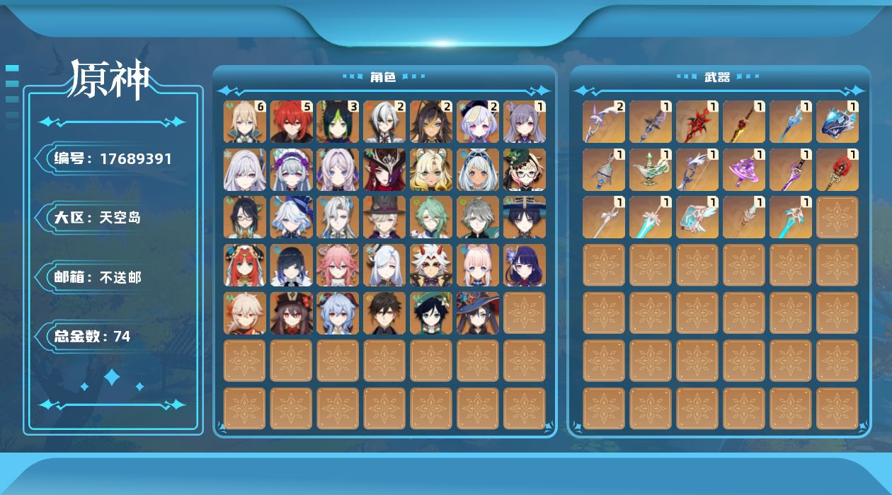 [17689391]60级/74黄/男主/34个五星角色/18个五星武器