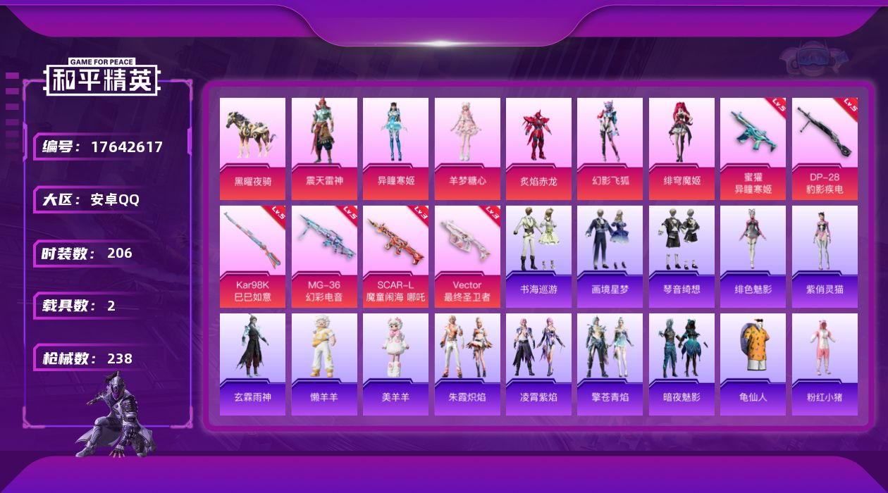 [17642617]安卓 手Q-1神装-9粉装-8特效枪-2载具-10粉色飞行器-84447热力值-14王牌印记-206套装-238枪皮