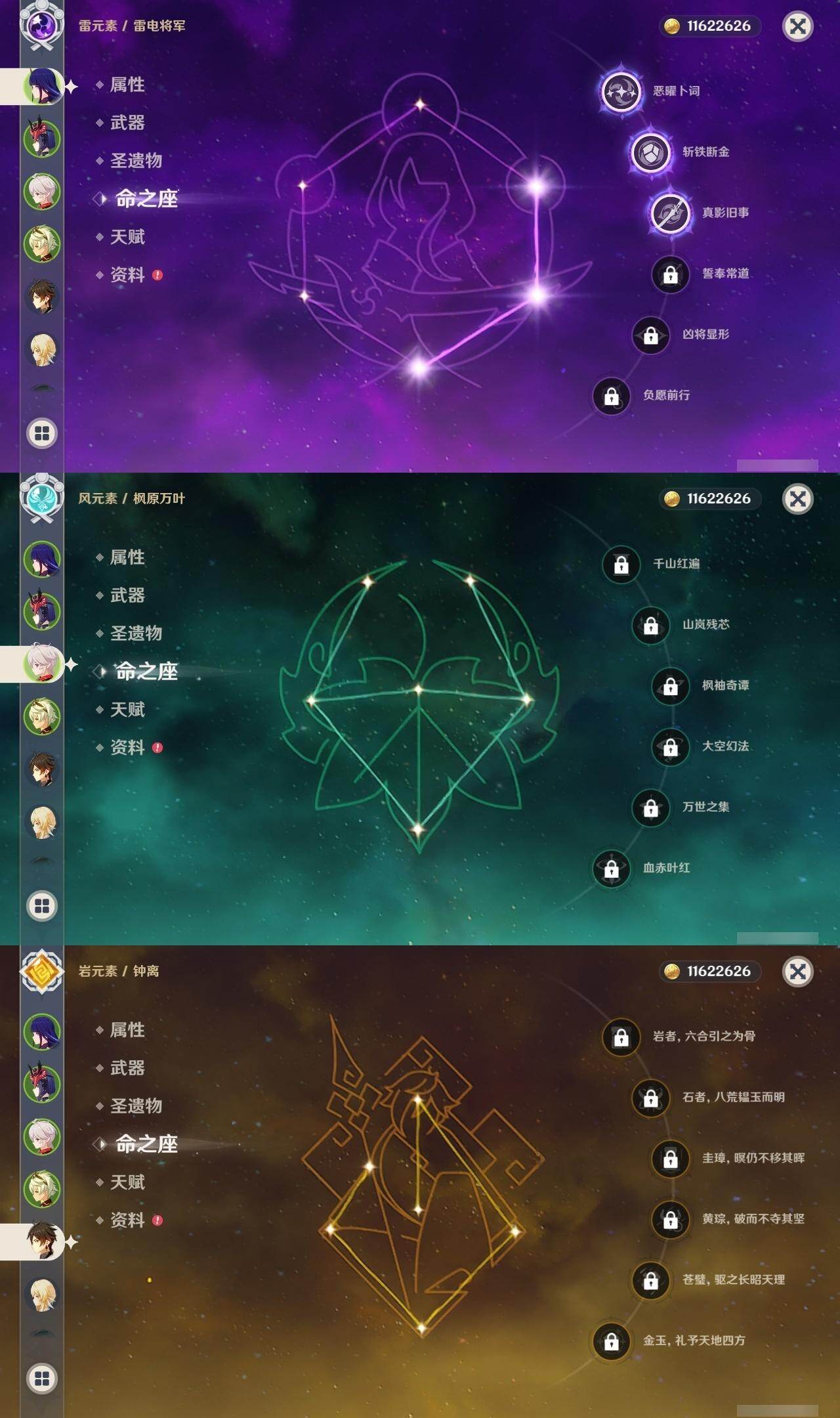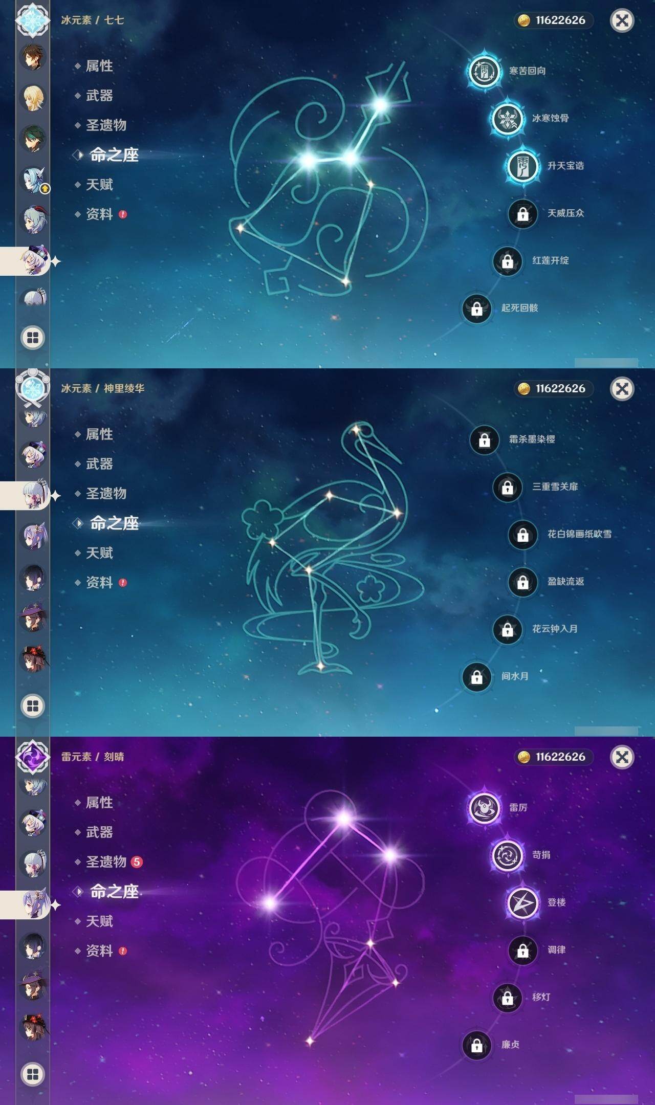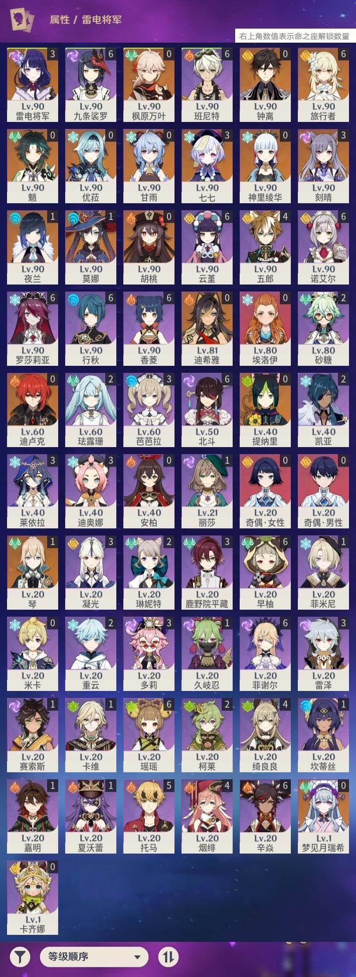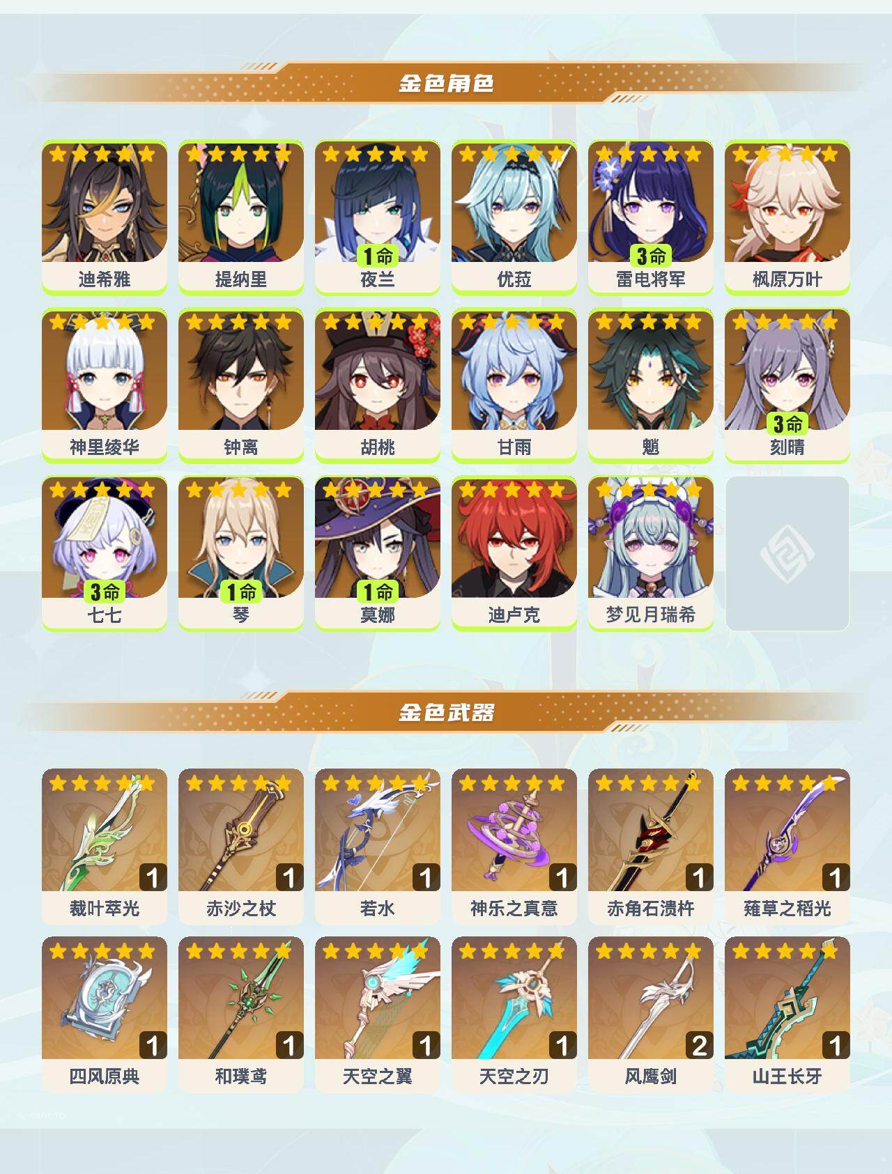 0命迪希雅,0命提纳里,1命夜兰,0命优菈,3命雷电将军,0命枫原万叶,0命神里绫华,0命钟离,0命胡桃,0命甘雨,0命魈,3命刻晴,3命七七,1命琴,1命莫娜,0命迪卢克,0命梦见月瑞希,精1裁叶萃光,精1赤沙之杖,精1若水,精1神乐之真意,精1赤角石溃杵,精1薙草之稻光,精1四风原典,精1和璞鸢,精1天空之翼,精1天空之刃,精2风鹰剑,精1山王长牙