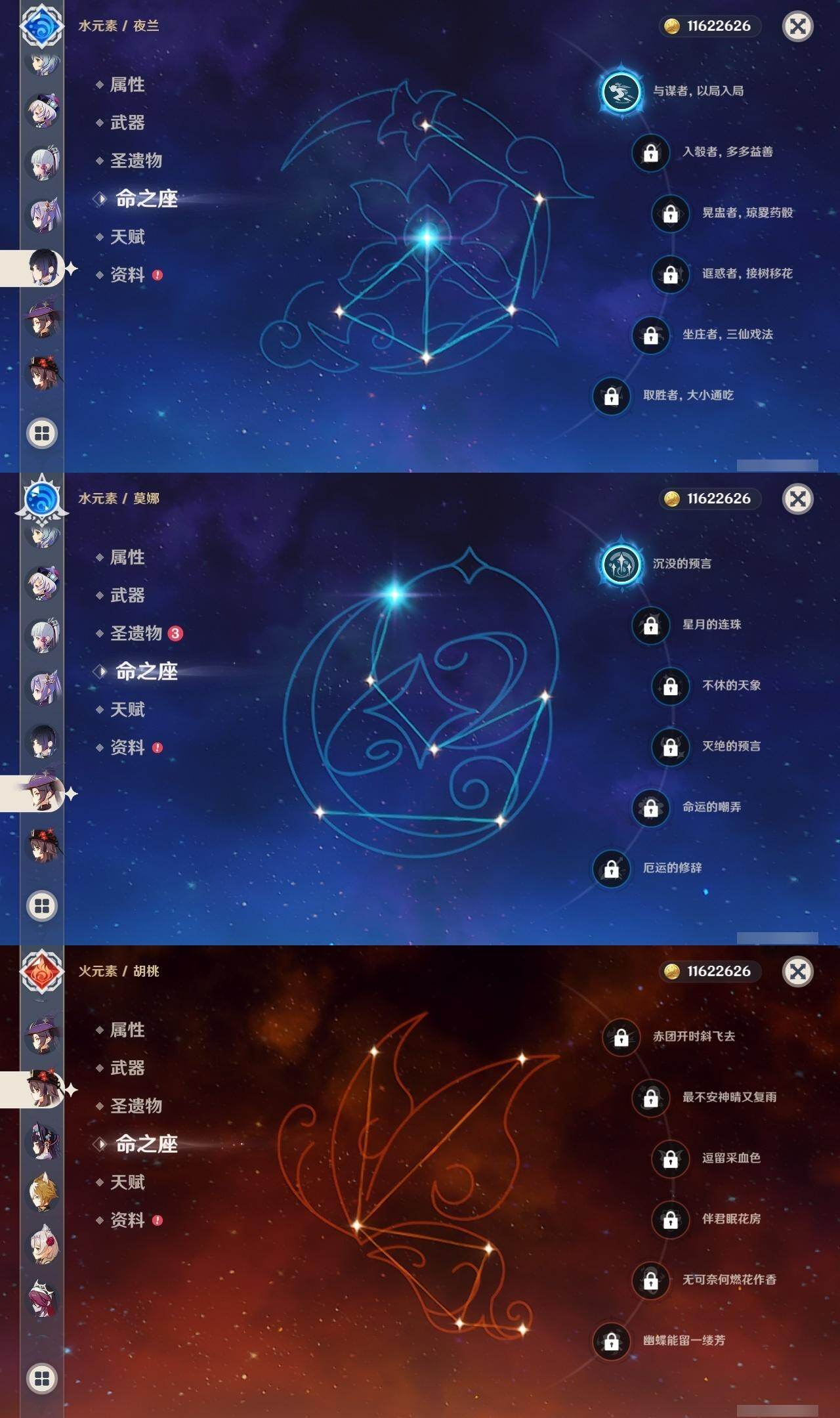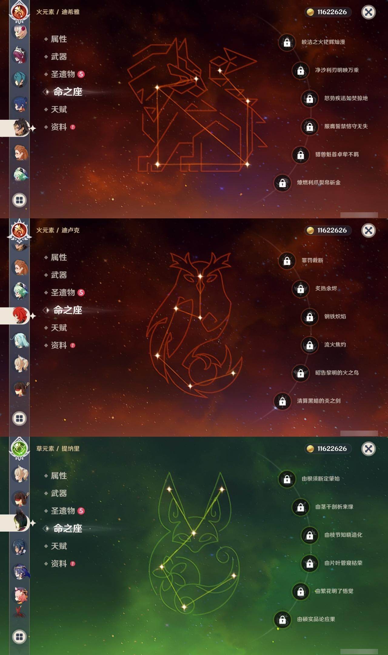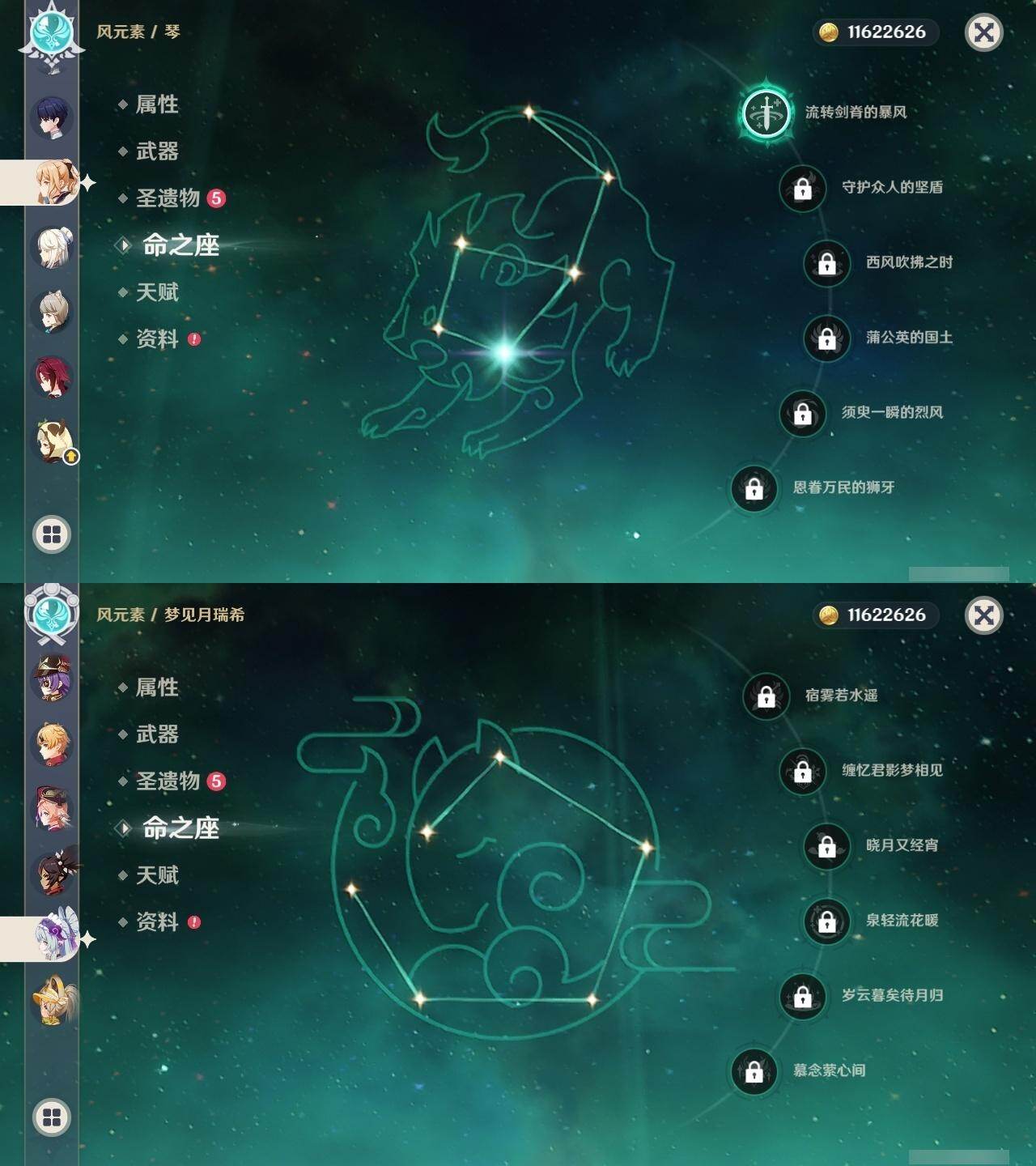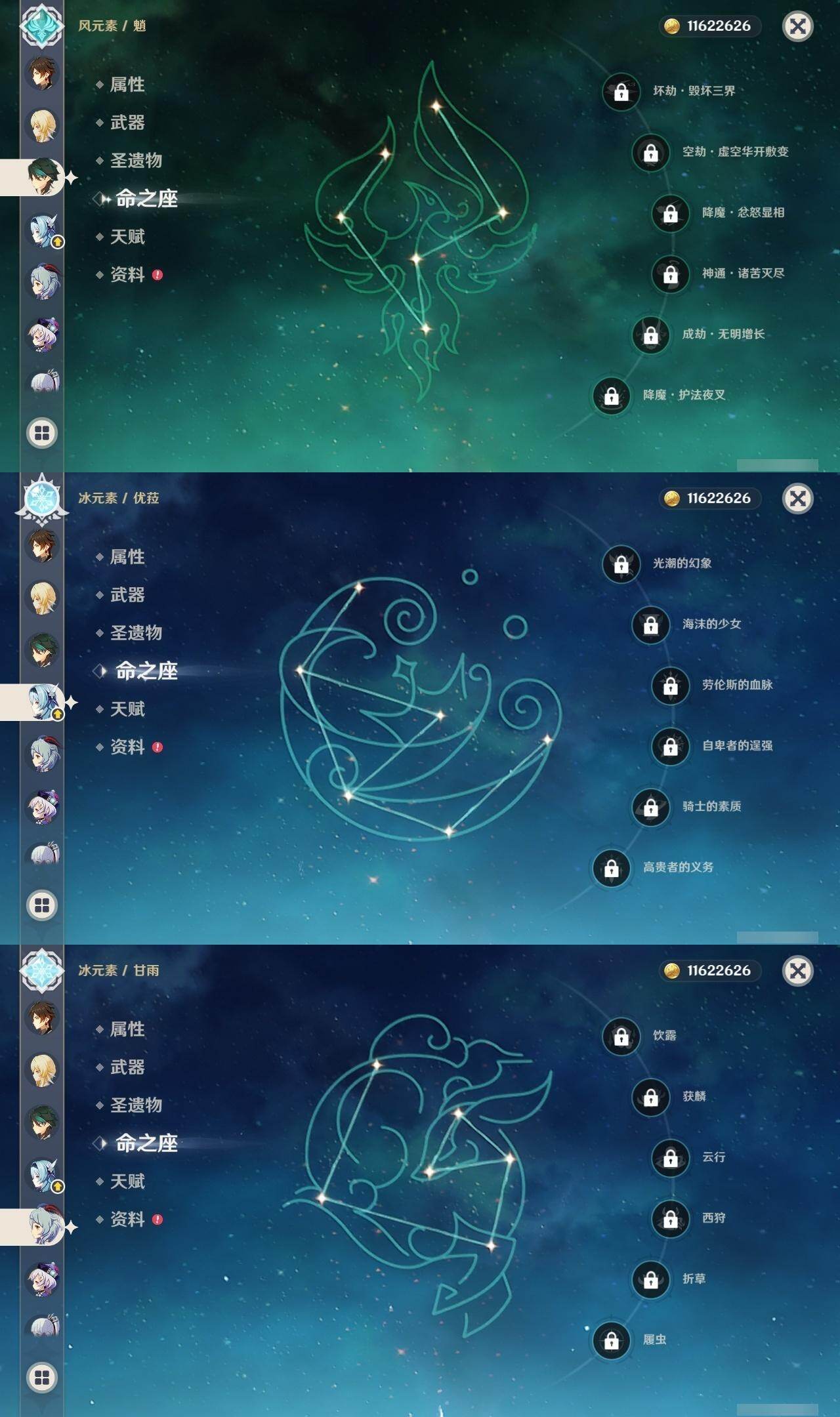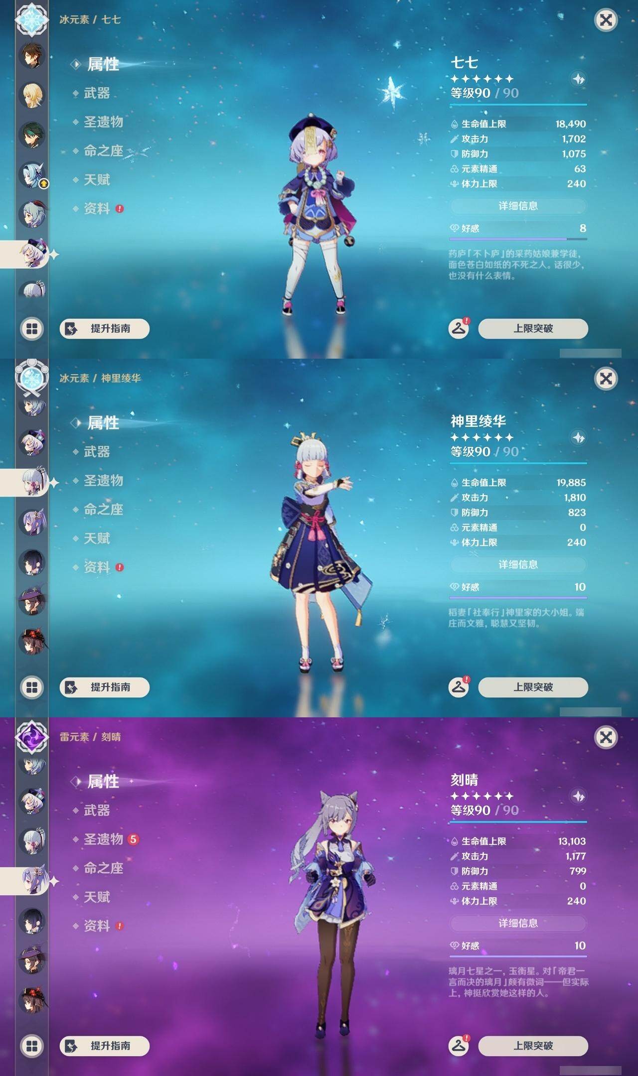 0命迪希雅,0命提纳里,1命夜兰,0命优菈,3命雷电将军,0命枫原万叶,0命神里绫华,0命钟离,0命胡桃,0命甘雨,0命魈,3命刻晴,3命七七,1命琴,1命莫娜,0命迪卢克,0命梦见月瑞希,精1裁叶萃光,精1赤沙之杖,精1若水,精1神乐之真意,精1赤角石溃杵,精1薙草之稻光,精1四风原典,精1和璞鸢,精1天空之翼,精1天空之刃,精2风鹰剑,精1山王长牙