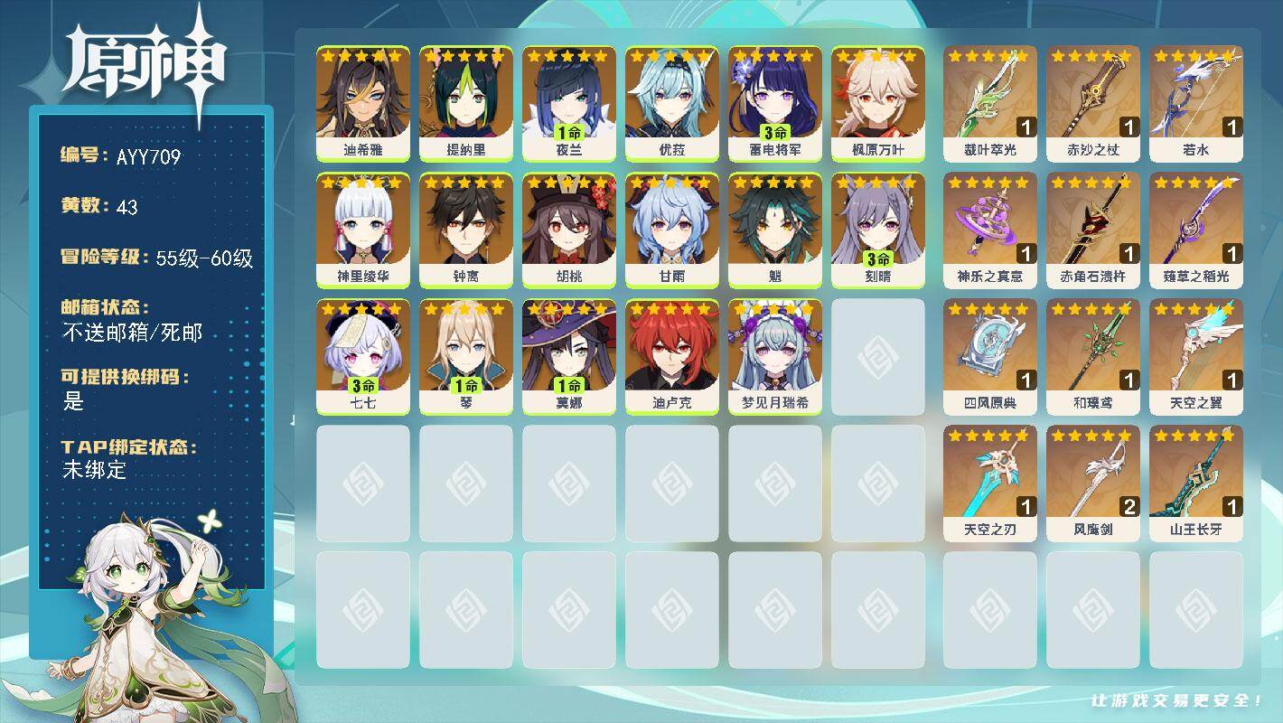 [17690962]60级/43黄/女主/17个五星角色/13个五星武器 0命迪希雅,0命提纳里,1命夜兰,0命优菈,3命雷电将军,0命枫原万叶,0命神里绫华,0命钟离,0命胡桃,0命甘雨,0命魈,3命刻晴,3命七七,1命琴,1命莫娜,0命迪卢克,0命梦见月瑞希,精1裁叶萃光,精1赤沙之杖,精1若水,精1神乐之真意,精1赤角石溃杵,精1薙草之稻光,精1四风原典,精1和璞鸢,精1天空之翼,精1天空之刃,精2风鹰剑,精1山王长牙