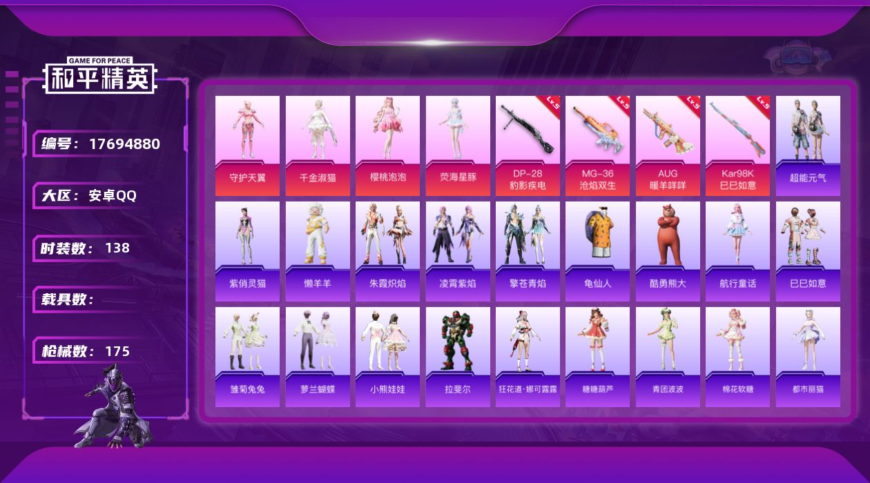 [17694880]安卓 手Q-4粉装-7特效枪-0载具-1粉色飞行器-56805热力值-10王牌印记-138套装-175枪皮 【热门品类】:套装-龟仙人 【粉色套装】:角色-守护天翼,角色-千金淑猫,角色-樱桃泡泡,角色-荧海星豚 【粉色枪皮等级】:AUG-暖羊咩咩(五级),AKS-74U-森灵之息(五级),Kar98K-巳巳如意(五级),Mk14-福马献瑞(五级),DP-28-豹影疾电(五级),PKM-萌骑夺宝(五级),MG-36-沧焰双生(五级) 【粉色枪皮】:AUG-暖羊咩咩,AKS-74U-森灵之息,Kar98K-巳巳如意,Mk14-福马献瑞,DP-28-豹影疾电,PKM-萌骑夺宝,MG-36-沧焰双生 【粉色飞行器】:炫彩糖果飞行器 【粉色降落伞】:绝对恒星降落伞,圣堂之誓降落伞,夜幕颂歌降落伞,拳皇·狂花道降落伞,未来领航者降落伞,千金淑猫降落伞,临安公主降落伞,月影灵韵降落伞,樱桃泡泡降落伞,绯穹魔姬降落伞,喜羊羊与灰太狼降落伞,异瞳寒姬降落伞,极意拳锋降落伞,炫彩糖果降落伞,虹云熊熊降落伞 【稀有套装】:套装-龟仙人,玩偶服-酷勇熊大,套装-航行童话,套装-巳巳如意,套装-超能元气,套装-雪国风尚,套装-炫彩糖果,角色-幸运青,套装-马上有钱,套装-雏菊兔兔,套装-萝兰蝴蝶,套装-小熊娃娃,角色-拉斐尔,角色-狂花道·娜可露露,套装-糖糖葫芦,套装-青团波波,套装-棉花软糖,角色-都市丽猫,角色-摩登魅猫,角色-俏兔智灵,角色-光矢逐梦,套装-燕燕于飞,套装-鱼渊荷华,角色-糖霜甜心,套装-彩虹兔,套装-云朵鹅,套装-雪绒豹,套装-蜜露汐语,套装-蓝海鲸歌,套装-朱霞炽焰,套装-凌霄紫焰,套装-擎苍青焰,玩偶服-懒羊羊,角色-紫俏灵猫,套装-雨过天青,套装-红釉青花,角色-曹焱兵 【稀有枪皮】:AUG-冰晶雪宝,AKM-破晓战魂,AKM-龙的传人,M16A4-幻世战舞者,M16A4-千金淑猫,M416-糯团青竹,M416-蓝色火焰,AUG-甜蜜菠萝,AUG-耀粉歌者,AUG-月影灵韵,M762-天降萌叽,M762-奇异狩猎者,M762-牛气冲天,M762-云朵鹅,Mk47-虹云熊熊,G36C-不夜海上花,G36C-懵萌河马,AC-VAL-快闪甜心,蜜獾-天降萌叽,ARX-凌霄紫焰,UZI-啾咪啾咪,UZI-天降萌叽,UZI-月影灵韵,UMP45-极意拳锋,Vecto
