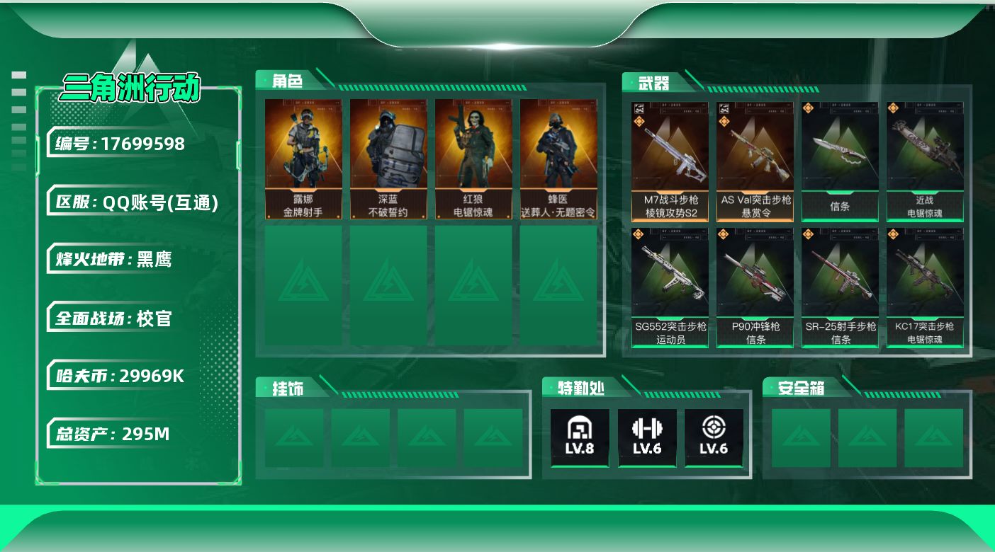 [17699598]【特价出售/店主推荐】295m总资产-29969k哈伏币-60烽火等级-黑鹰-40战场等级-校官 【干员外观】:蜂医-送葬人·无题密令,深蓝-不破誓约,红狼-电锯惊魂,露娜-金牌射手 【近战皮肤】:近战-电锯惊魂,近战-信条,近战-黑鹰 【典藏外观】:M7战斗步枪-棱镜攻势S2,AS Val突击步枪-悬赏令 【传说外观】:M4A1突击步枪-阿米娅,ASh-12战斗步枪-鹅鸭杀,M16A4突击步枪-狩猎时刻,SG552突击步枪-运动员,SCAR-H战斗步枪-启航,G3战斗步枪-狩猎时刻,G3战斗步枪-骑士,CAR-15突击步枪-阿米娅,KC17突击步枪-电锯惊魂,P90冲锋枪-信条,Vector冲锋枪-狩猎时刻,勇士冲锋枪-能天使-午夜邮差,QCQ171冲锋枪-鹅鸭杀,S12K霰弹枪-电锯惊魂,725双管霰弹枪-送葬人-无题密令,M250通用机枪-骑士之心,QJB201轻机枪-鹅鸭杀,M14射手步枪-电锯惊魂,SR-25射手步枪-信条,复合弓-黑·天际线 【史诗外观】:ASh-12战斗步枪-无极限,M16A4突击步枪-竞赛选手,AUG突击步枪-蝮蛇,M7战斗步枪-百步穿杨,SCAR-H战斗步枪-囚徒,G3战斗步枪-流沙送葬,AS Val突击步枪-典狱官,AS Val突击步枪-百步穿杨,腾龙突击步枪-无垢,腾龙突击步枪-猎鳄行动,K437突击步枪-守护者,MP5冲锋枪-战术竞备,MP5冲锋枪-竞技风,Vector冲锋枪-猎鳄行动,Vector冲锋枪-百步穿杨,Vector冲锋枪-异域战争,SR-3M紧凑突击步枪-荒野求生,SR-3M紧凑突击步枪-战术竞备,勇士冲锋枪-工业狂潮,MP7冲锋枪-无垢,MP7冲锋枪-守护者,PKM通用机枪-蝮蛇,PKM通用机枪-荒野求生,M250通用机枪-囚徒,Mini-14射手步枪-守护者,SVD狙击步枪-阿萨拉工艺,SVD狙击步枪-荒野求生,M14射手步枪-工业狂潮,PSG-1射手步枪-无垢,SV-98狙击步枪-林中猎手,SV-98狙击步枪-猎鳄行动,M700狙击步枪-竞技风,M700狙击步枪-百步穿杨,M700狙击步枪-哈夫克警备,AWM狙击步枪-无极限,AWM狙击步枪-流沙送葬,复合弓-守护者 【稀有外观】:M14射手步枪-巨兽,K437突击步枪-巨兽,M4A1突击步枪-繁盛,AKM突击步枪-战术演练,AKM突击步枪-肃杀,QBZ9