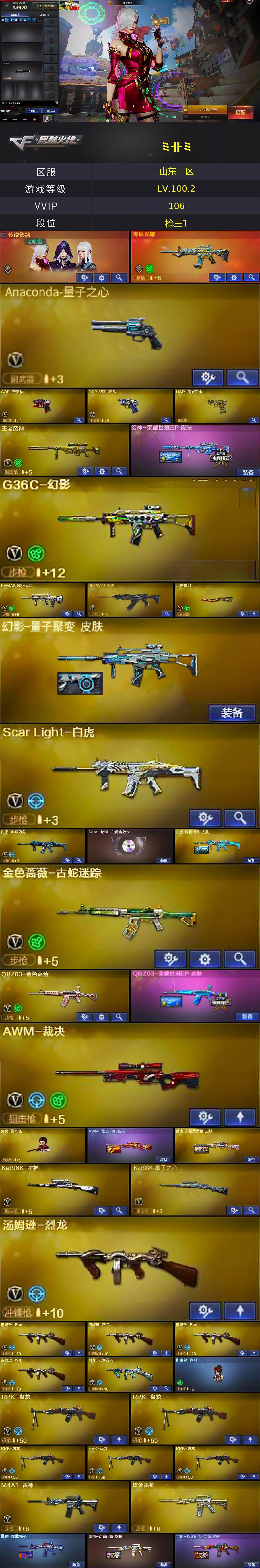 [17702258]山东一区-105V-25王者武器数-3炫金武器数 【传说武器】:传说光耀 【传说角色】:传说影煞 【热门武器】:传说光耀,G36C-幻影,QBZ03-金色蔷薇,Scar Light-白虎,HK417-朱雀*2,金色蔷薇-古蛇迷踪,修罗-古蛇迷踪,死亡之眼,白虎-电玩蓝兔,Kar98K-星神,M4A1-黑骑士*3,汤姆逊-烈龙*5,RPK-盘龙*5,斯泰尔-蝴蝶,MK5-炽火炎龙,降世魔童*2,裁决-雪莉杨,COP-堕天神,沙鹰-修罗*3,炽芒蝶刃,黄金猫猫手套-白鲨 【王者炫金武器】:王者之戮,玫瑰精灵-悦动,AK47-雷暴王者,炼狱-悦蓝,USP-雷暴王者,斩神刀-雷暴王者,炫金雷神,炫金武士,炫金超新星 【音效卡】:Barrett-毁灭音效卡,Scar Light-白虎音效卡,宋雨琦语音包 【皮肤】:幻神-荣耀世冠EP 皮肤,白虎-梅雀衔霜 皮肤,QBZ03-荣耀世冠EP 皮肤,AWM-裁决-凤灵皮肤,裁决-永恒紫罗兰 皮肤,雷神-能量核心,雷神-动感闪耀 皮肤,雷神-源计划2.0专属 皮肤,雷神-宋雨琦 皮肤,火麒麟-雷神*2,毁灭-暗月,毁灭耀金皮肤,毁灭-英雄计划 皮肤,黑龙-能量核心,无影-暗月,幻影-量子聚变 皮肤,烈火-熔核皮肤,战神-粉色甜心皮肤,AK47-B-常胜将军-刘备,AK47-B-常胜将军-孙权,修罗-冠军之魂,屠龙-破浪逐光 皮肤,麒麟刺-甜蜜糖果 皮肤,麒麟刺-量子聚变 皮肤,炽芒蝶刃-宋雨琦 皮肤 【角色】:迷迭香,电竞教官-云悠悠,关小雨,隼,妮妮,智,虹儿,王者玲珑,王者-迷迭香,王者炽天使,蛇隐宗,奇洋探员,乔伊教练,修道士,云海玲珑,幻面灵狐,初恋灵狐,飞虎队-X,风暴女,嘉年华灵狐,零-水下丽影,曼陀罗-X,潘多拉-甜心教官,潜龙队-X,青霞仙子,蛇姬,斯沃特-X,蜀雪,兔囡囡,五号兵器-赛博朋克,新娜塔莎,雪莉杨,影武者-X,游珑儿,职业选手 【人偶武器】:裁决-雪莉杨,迷你宝贝,金蚀-机械姬,雷神-研,迷你钢铁终结者,MK5-炽火炎龙,斯泰尔-蝴蝶,斯泰尔-枪娘暗刃,AWM-灵狐-15周年嘉年华,迷你深渊冰龙*2,迷你裂空之翼,迷你牛魔王,夺魂,迷你牛牛,迷你生化手雷,生化手雷-机甲核心*4,深渊终结者手雷*2,迷你超能女侍,迷你巨石泰坦-魔花研究所,灵狐娃娃手雷*2,降世魔童*2 【暴走生化】:死亡之眼,超级对讲机