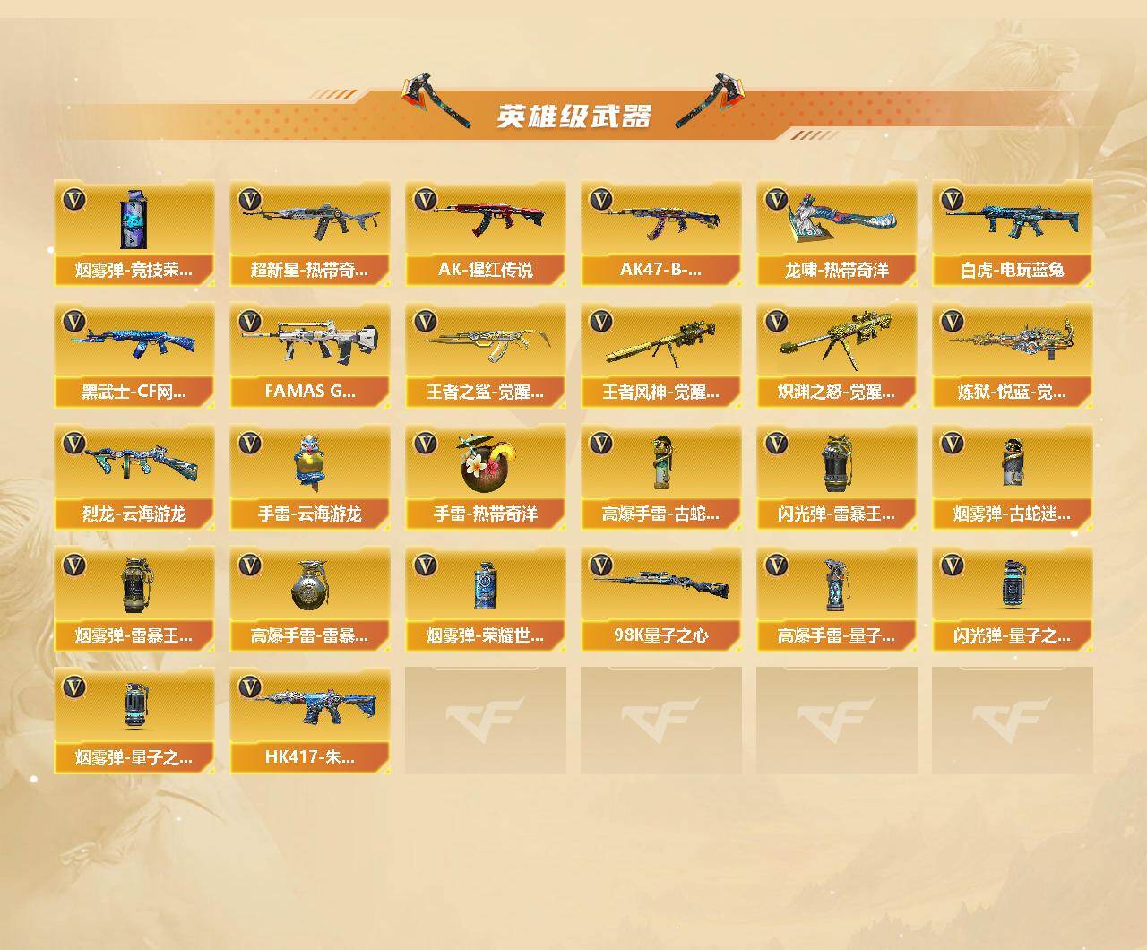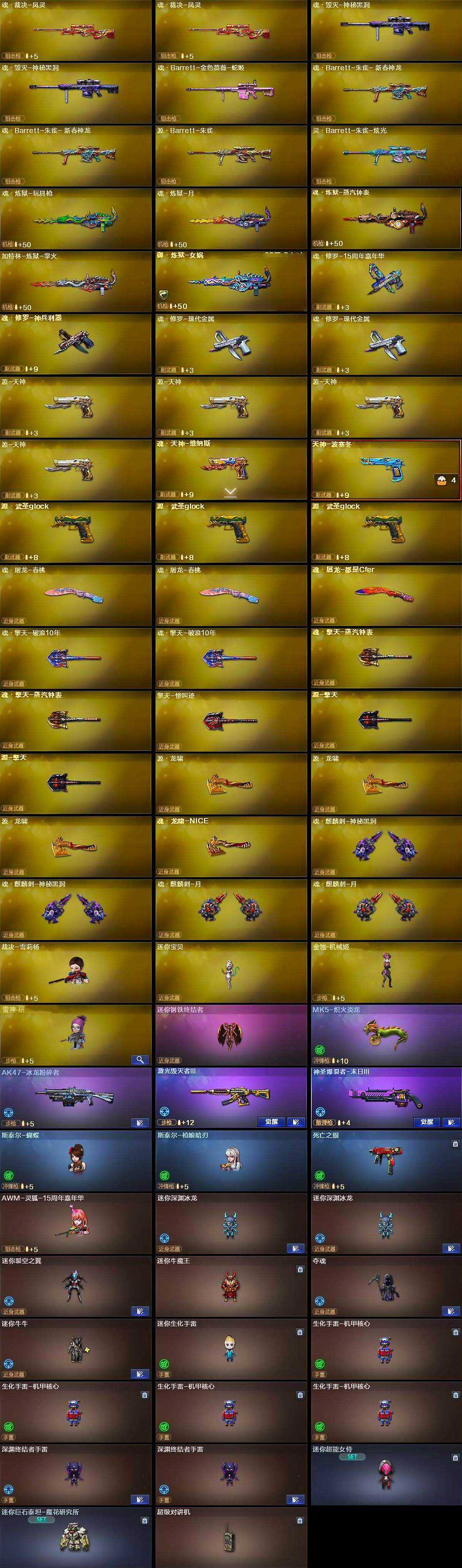 【热门武器】:传说光耀,G36C-幻影,QBZ03-金色蔷薇,Scar Light-白虎,HK417-朱雀*2,金色蔷薇-古蛇迷踪,修罗-古蛇迷踪,死亡之眼,白虎-电玩蓝兔,Kar98K-星神,M4A1-黑骑士*3,汤姆逊-烈龙*5,RPK-盘龙*5,斯泰尔-蝴蝶,MK5-炽火炎龙,降世魔童*2,裁决-雪莉杨,COP-堕天神,沙鹰-修罗*3,炽芒蝶刃,黄金猫猫手套-白鲨