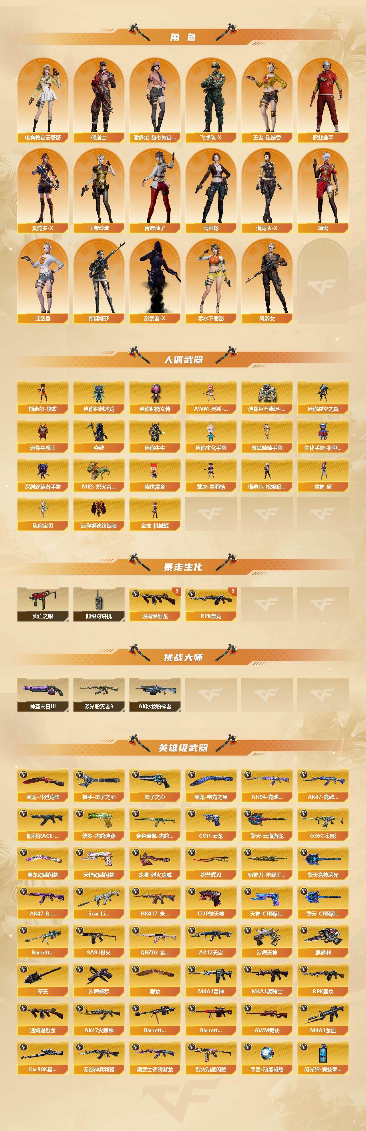 【人偶武器】:裁决-雪莉杨,迷你宝贝,金蚀-机械姬,雷神-研,迷你钢铁终结者,MK5-炽火炎龙,斯泰尔-蝴蝶,斯泰尔-枪娘暗刃,AWM-灵狐-15周年嘉年华,迷你深渊冰龙*2,迷你裂空之翼,迷你牛魔王,夺魂,迷你牛牛,迷你生化手雷,生化手雷-机甲核心*4,深渊终结者手雷*2,迷你超能女侍,迷你巨石泰坦-魔花研究所,灵狐娃娃手雷*2,降世魔童*2