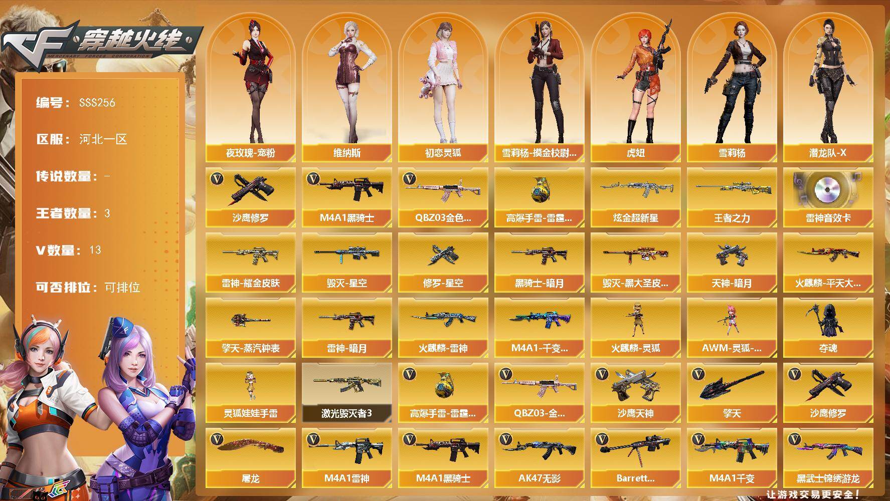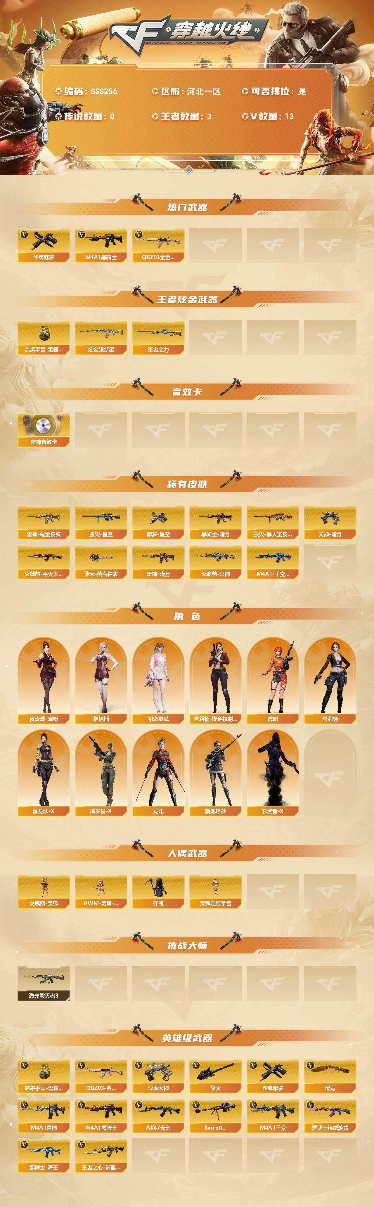 [17704382]河北一区-14V-3王者武器数-1炫金武器数 【热门武器】:QBZ03-金色蔷薇,M4A1-黑骑士,沙鹰-修罗*2 【王者炫金武器】:王者之力,高爆手雷-雷霆王者,炫金超新星 【音效卡】:M4A1-雷神音效卡 【皮肤】:雷神-暗月,雷神-耀金皮肤,火麒麟-雷神,火麒麟-平天大圣,毁灭-星空,毁灭-黑大圣皮肤,M4A1-千变-孔明皮肤,黑骑士-暗月,修罗-星空,天神-暗月,擎天-蒸汽钟表 皮肤 【角色】:初恋灵狐,虎妞,龙儿,潘多拉-X,潜龙队-X,维纳斯,新娜塔莎,雪莉杨,雪莉杨-摸金校尉,夜玫瑰-宠粉,影武者-X 【人偶武器】:火麒麟-灵狐,AWM-灵狐-15周年嘉年华,夺魂,灵狐娃娃手雷*2 【挑战大师】:激光毁灭者III*2 【英雄级武器】:M4A1-千变,M4A1-雷神,M4A1-黑骑士,AK47-无影,黑武士-锦绣游龙,QBZ03-金色蔷薇,王者之心-觉醒版,黑骑士-海王,Barrett-毁灭,沙鹰-修罗*2,沙鹰-天神,屠龙,擎天,高爆手雷-雷霆王者-觉醒版 【源级武器】:源·火麒麟*3,御·火麒麟-平天大圣,火麒麟-雷神,源-黑龙,御·黑龙-龙太子,源·雷神*3,魂·M4A1-雷神-化蛇,魂·雷神-维纳斯,魂·雷神-新春神龙,御·雷神-机甲刑天,御·雷神-烈虎,御·雷神-葫芦兄弟,御·雷神-小白龙*2,魂·黑骑士-摸金校尉,魂·黑骑士-现代金属,魂·黑骑士-幻能朋克*2,魂·黑骑士-破浪10年*2,御·黑骑士-冰魄,御·黑骑士·哪吒闹海,魂·超新星-春桃,源·武圣*2,源·机械迷城,魂·龙血-锋芒破茧,源·青龙,源·HK417-朱雀,魂·QBZ03-金色蔷薇-萌杀,魂·9A91·烈火-电子连击,源-极光,源·天龙*2,AWM-裁决-百城联赛天津,魂·裁决-凤灵,源·毁灭,魂·毁灭-秦师,魂·毁灭-青帝,魂·毁灭-神秘黑洞,御·毁灭-黑大圣*2,源·炼狱,魂·炼狱-玩具枪*2,魂·炼狱-蒸汽钟表*2,御·炼狱-女娲,魂·修罗-神兵利器*2,源·天神*3,魂·天神-宇航兔兔,源·武圣glock,魂·屠龙-春桃,魂·屠龙-惊鸿,源·擎天-萌杀,源·龙啸*2,魂·麒麟刺-神秘黑洞*2 【道具】:战舰背包,炫彩背包,超级背包,救世主-黑桃战神,绿色巨人,夺命之镰,防化服*2,金色流光-枪王排位*2,星辰流光-枪王排位,巅峰赛先锋-金色流光,枪王排位28赛季金色