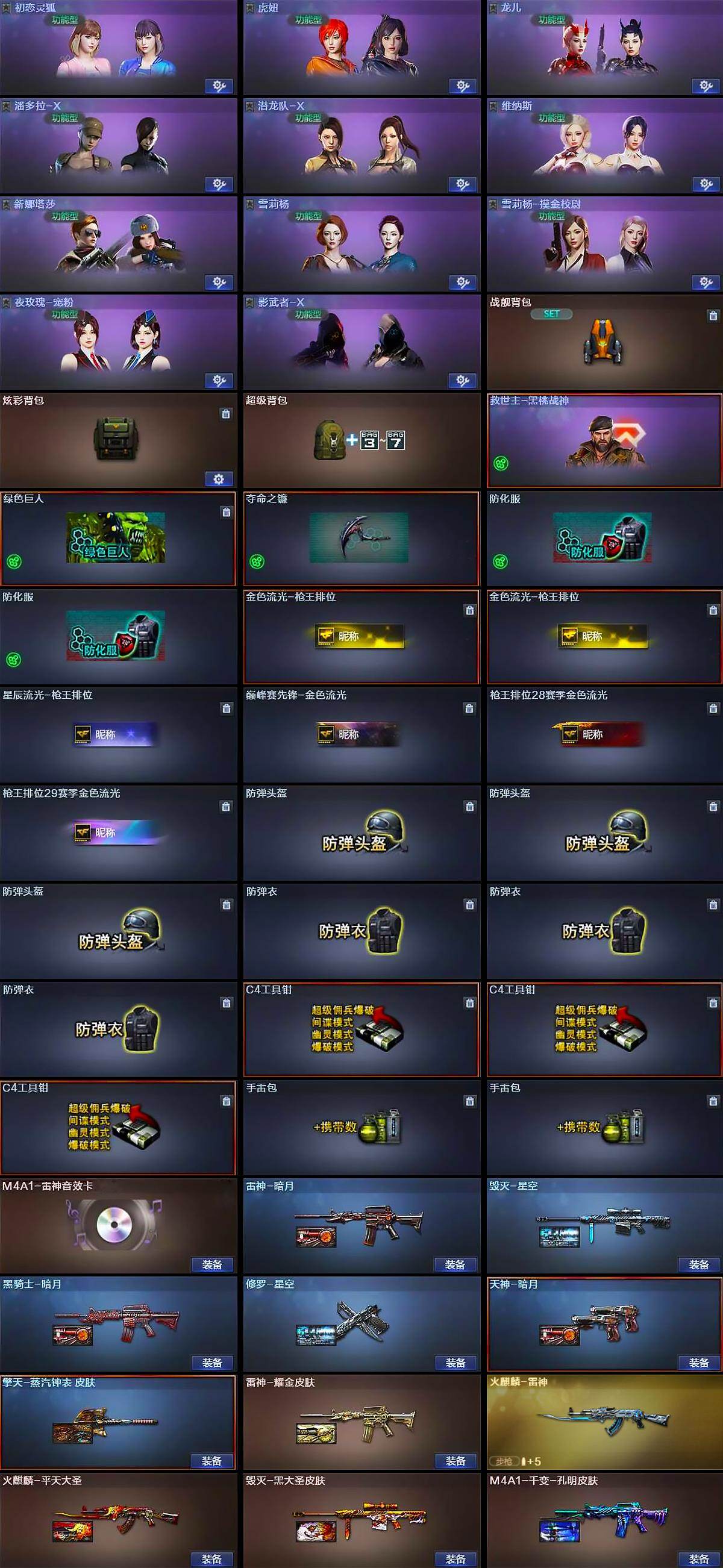 【道具】:战舰背包,炫彩背包,超级背包,救世主-黑桃战神,绿色巨人,夺命之镰,防化服*2,金色流光-枪王排位*2,星辰流光-枪王排位,巅峰赛先锋-金色流光,枪王排位28赛季金色